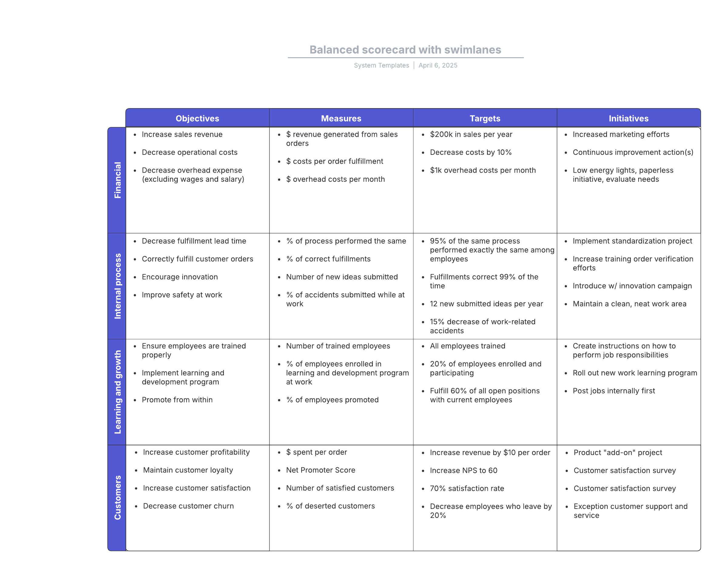 Open this template to view a detailed example of a basic balanced scorecard diagram that you can customize to your use case.
