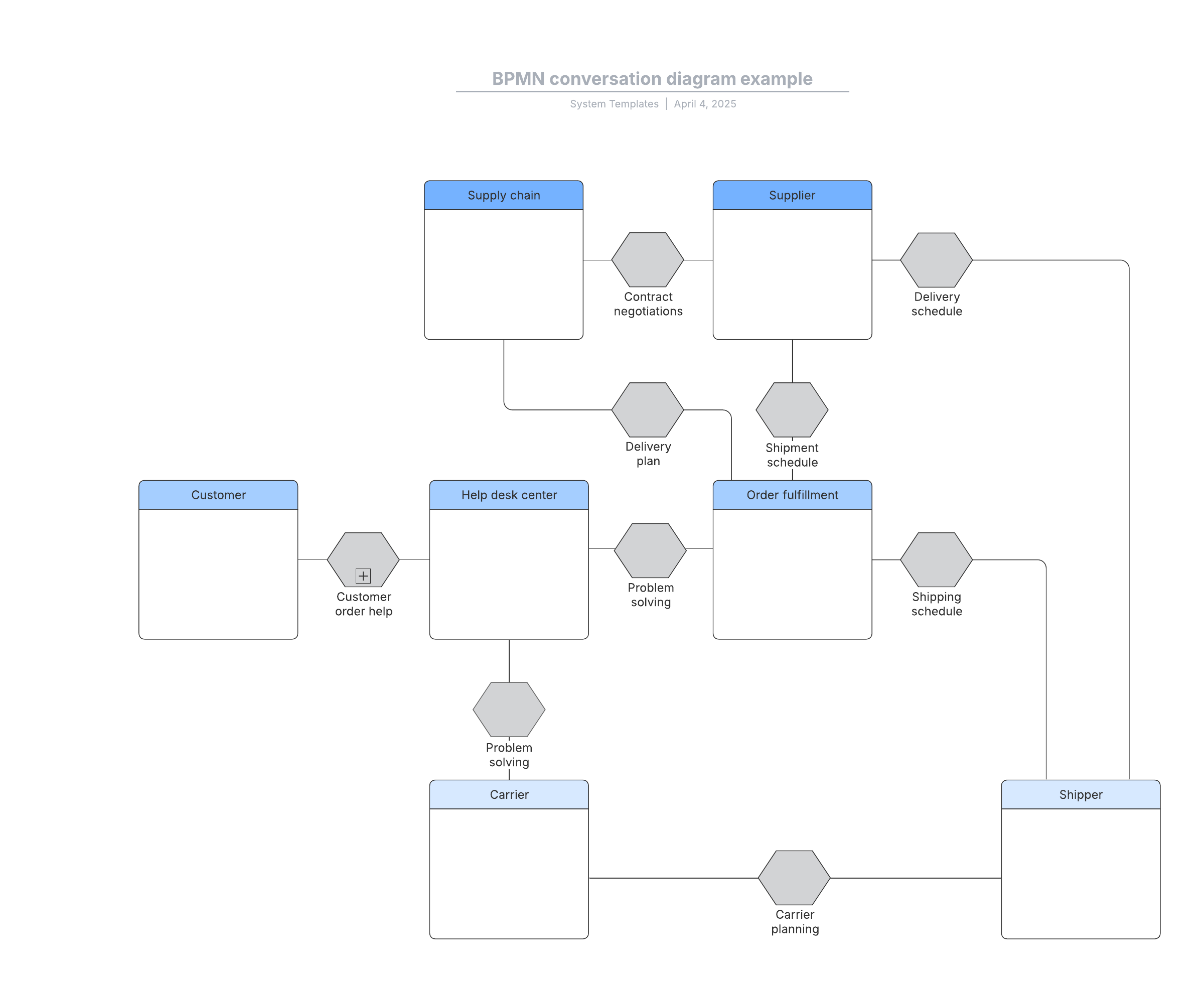Open this template to view a detailed example of BPMN conversation diagram that you can customize to your use case.