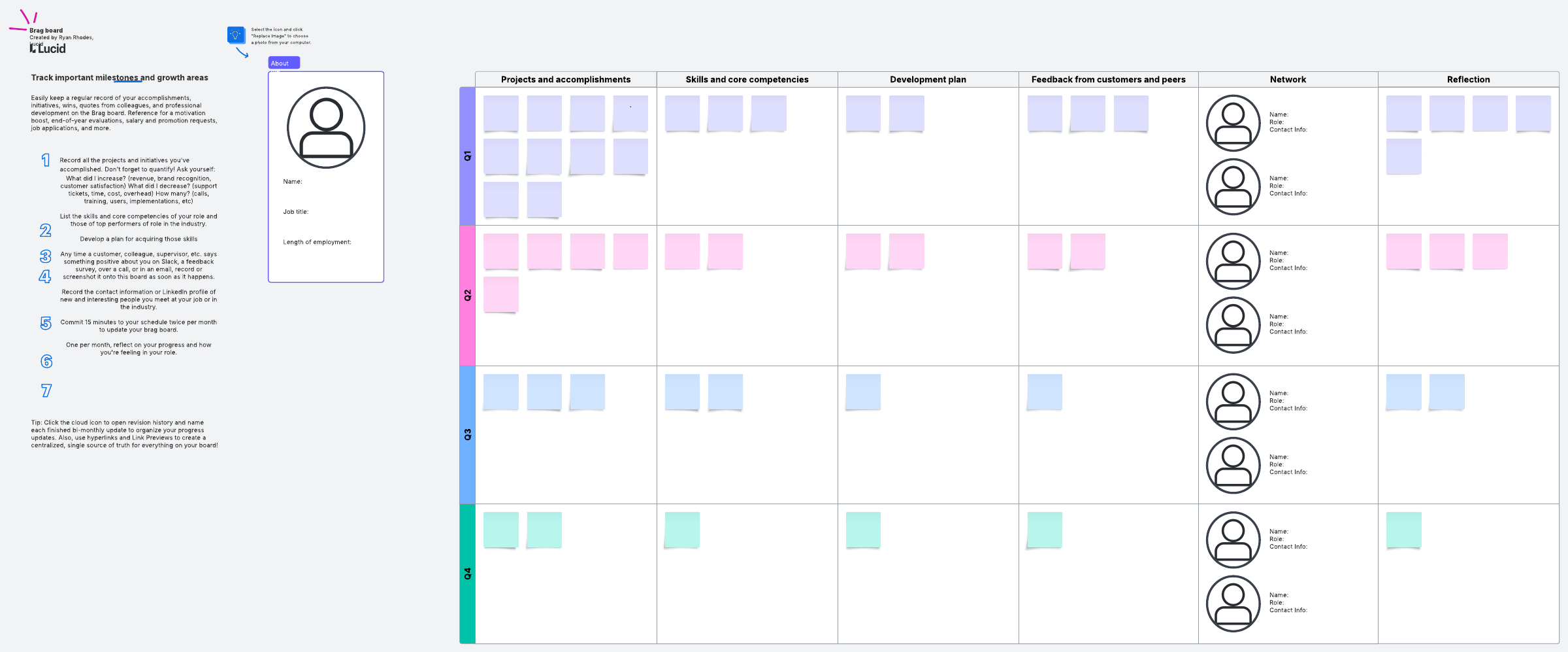 - Keep track. Under each quarter, input projects and accomplishments. Your brag board will be something you work on continually, so you don’t need to try to fill out every quarter at once. Start in the previous quarter or in the current quarter. Don’t forget to quantify your accomplishments here.