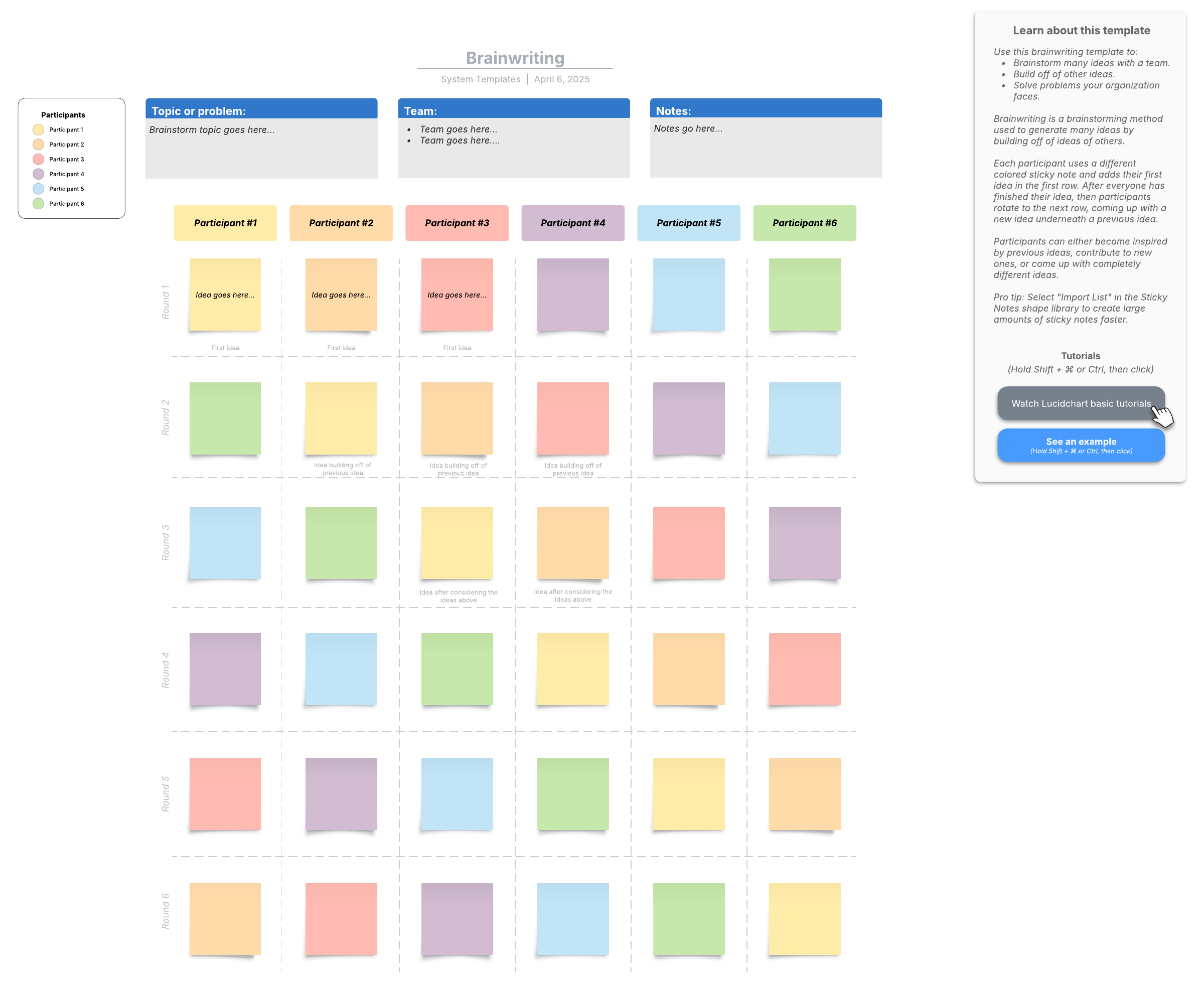 Open this template and add content to customize this brainwriting diagram to your use case.