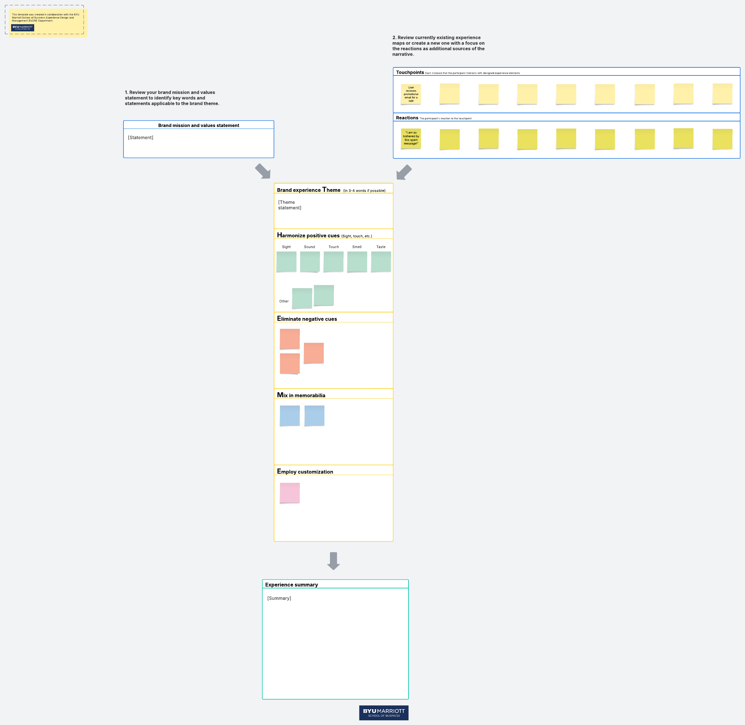 Craft your brand experience guide by incorporating your mission, values, touchpoints, and reactions from your experience map. From here, utilize the THEME framework (Pine & Gilmore, 1999) to write a clear and concise summary of your overall brand experience.