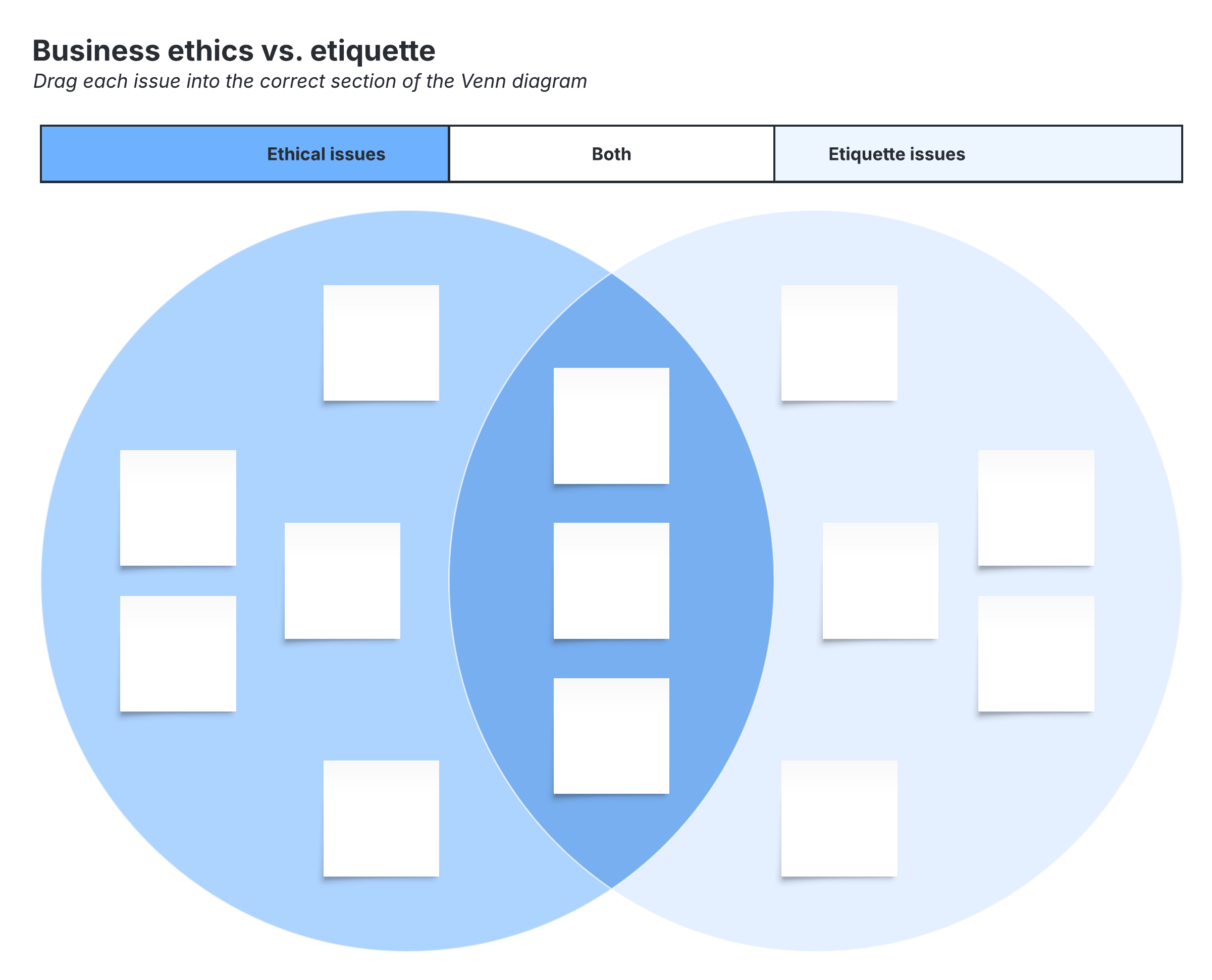 This Business ethics vs. etiquette: Venn diagram template can help you:
