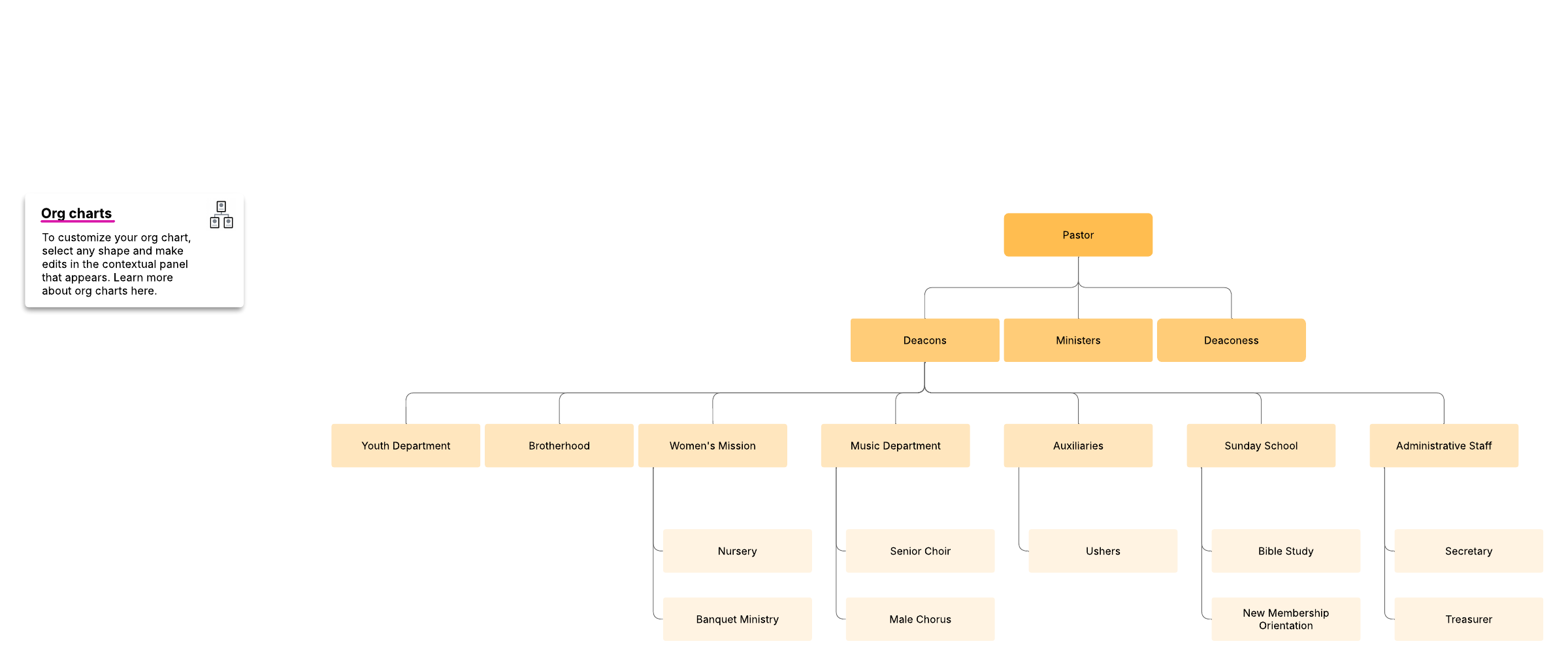 Open this template to view a detailed example of a church org chart that you can customize to your use case.