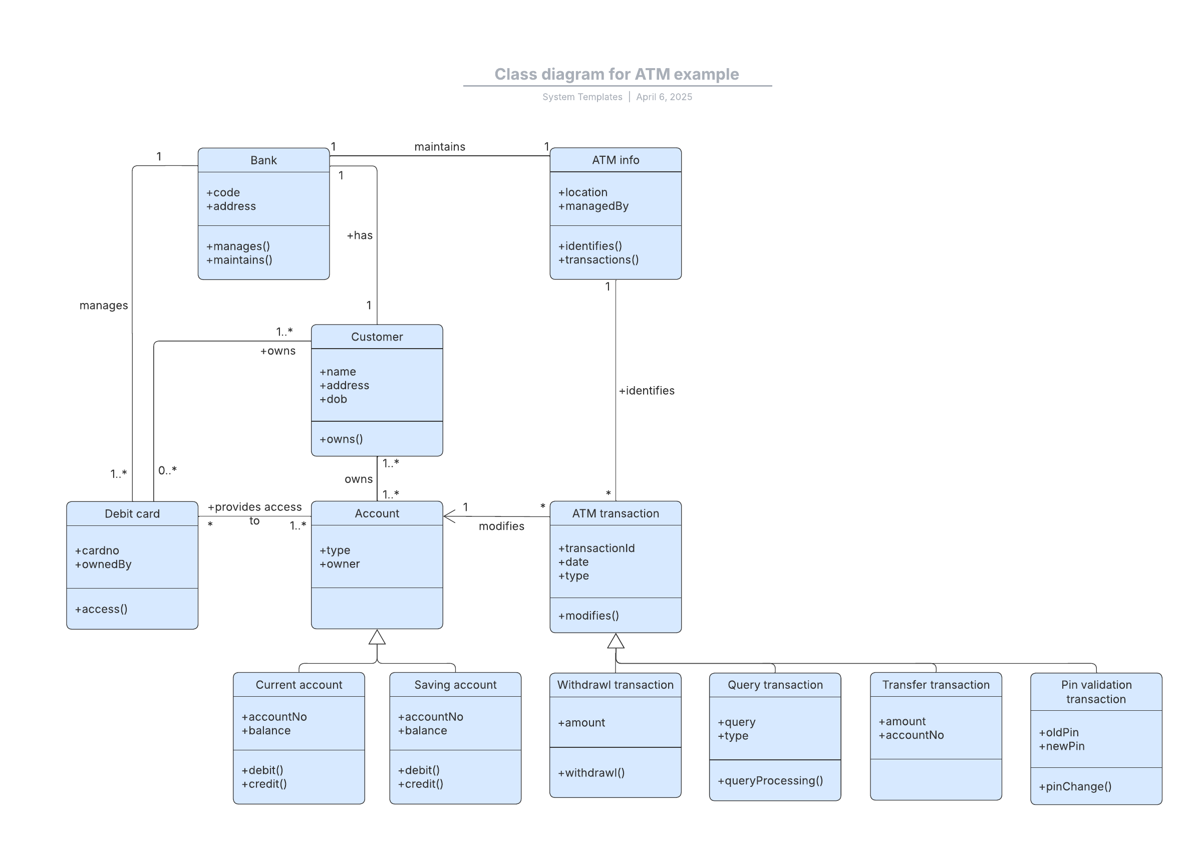 Open this template to view a detailed example of a class diagram for ATM that you can customize to your use case.