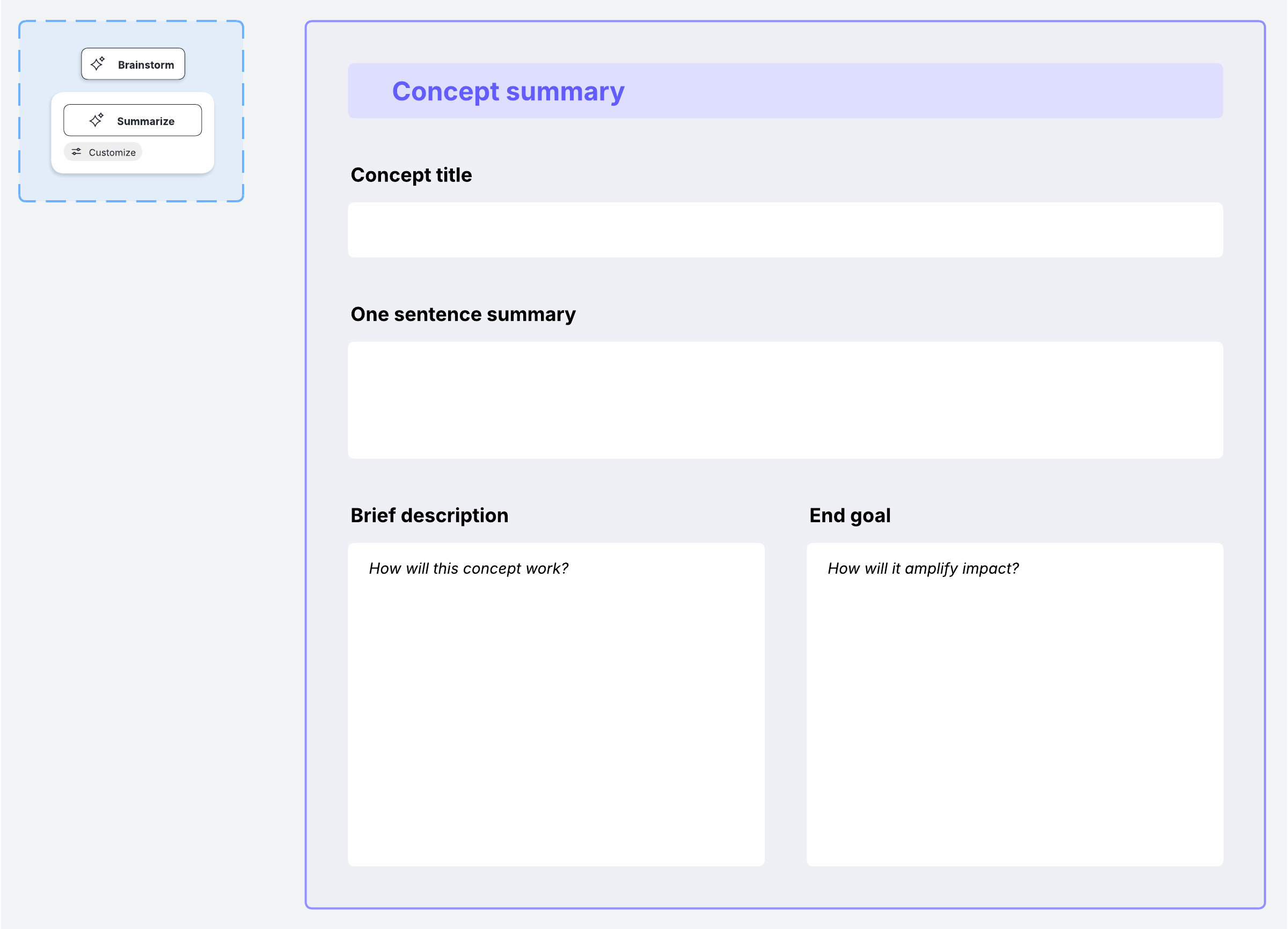 Whether you’re collaborating with others on your concept statement or simply want to make it widely available for suggestions, Lucidspark’s template can help. Our template encourages you to come up with a concept title, a one-sentence summary of the concept, a brief description of how the concept will work, and a brief description of what the concept will eventually accomplish.