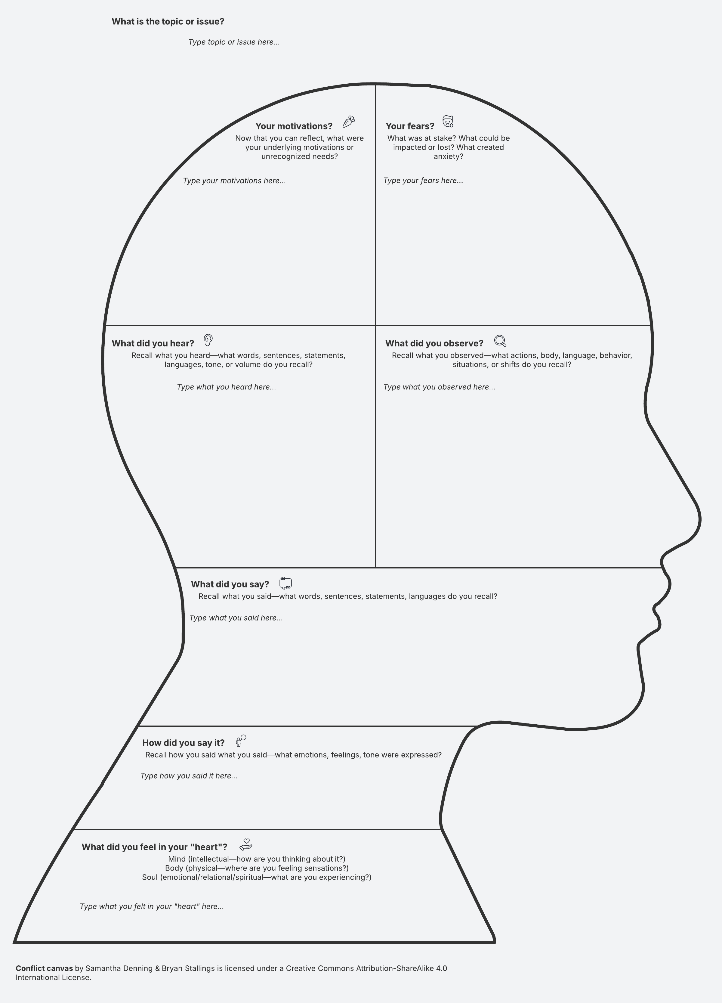 Conflict happens, and having the right skills to handle it is invaluable. Use this conflict canvas as an individual or as part of a team self-reflection. Prepare for conflict by answering questions around your motivations, observations, feelings, and what you heard. This conflict canvas was created in collaboration with professional coaches Samantha Denning and Bryan Stallings.