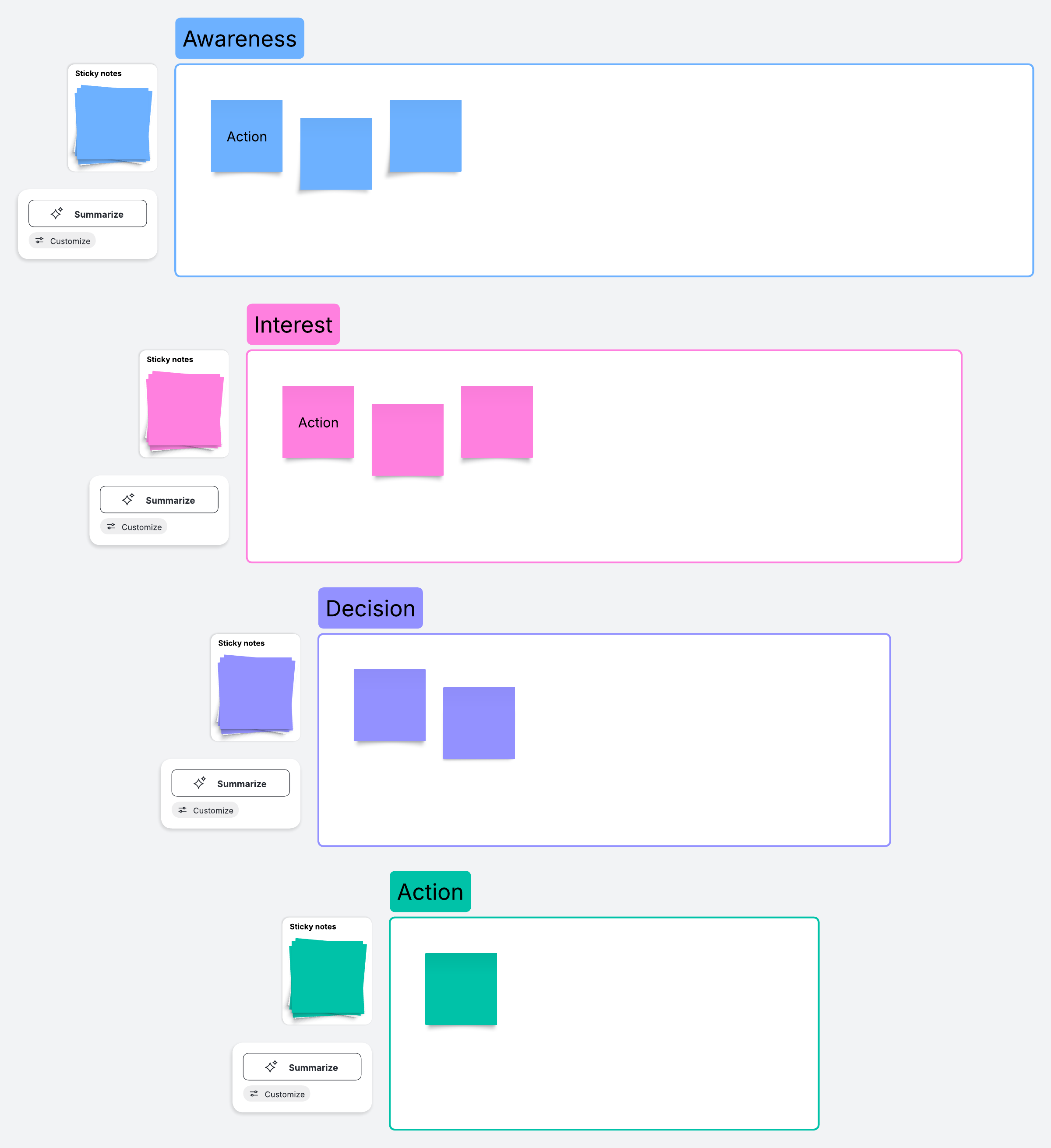 Brainstorm with your team about how to guide potential customers to make a purchase (Tip: Start with a persona template to ensure your team properly understands your customers). In each section of the conversion funnel template, we’ve included sticky notes—fill those out with what actions could best help a customer at that stage.