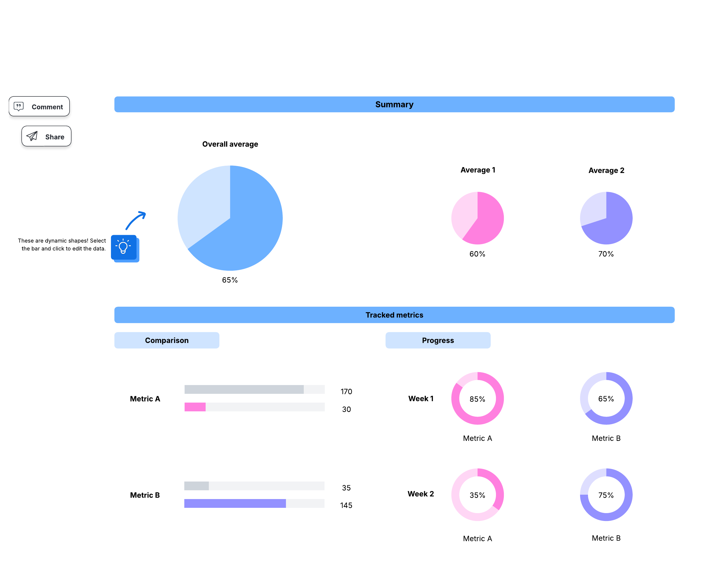 Open this template to view a detailed example of a dashboard with dynamic shapes that you can customize to your use case.
