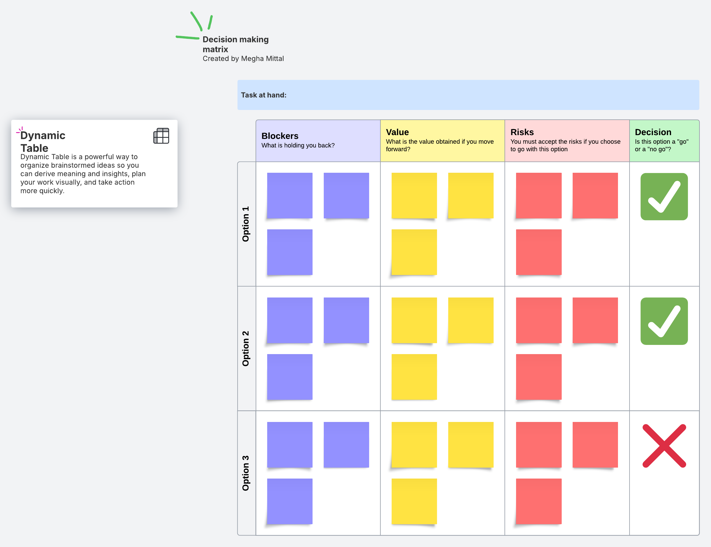 Identify and evaluate ways to accomplish a task by assessing blockers, value, and risk. Make smart choices with the Decision Making Matrix.