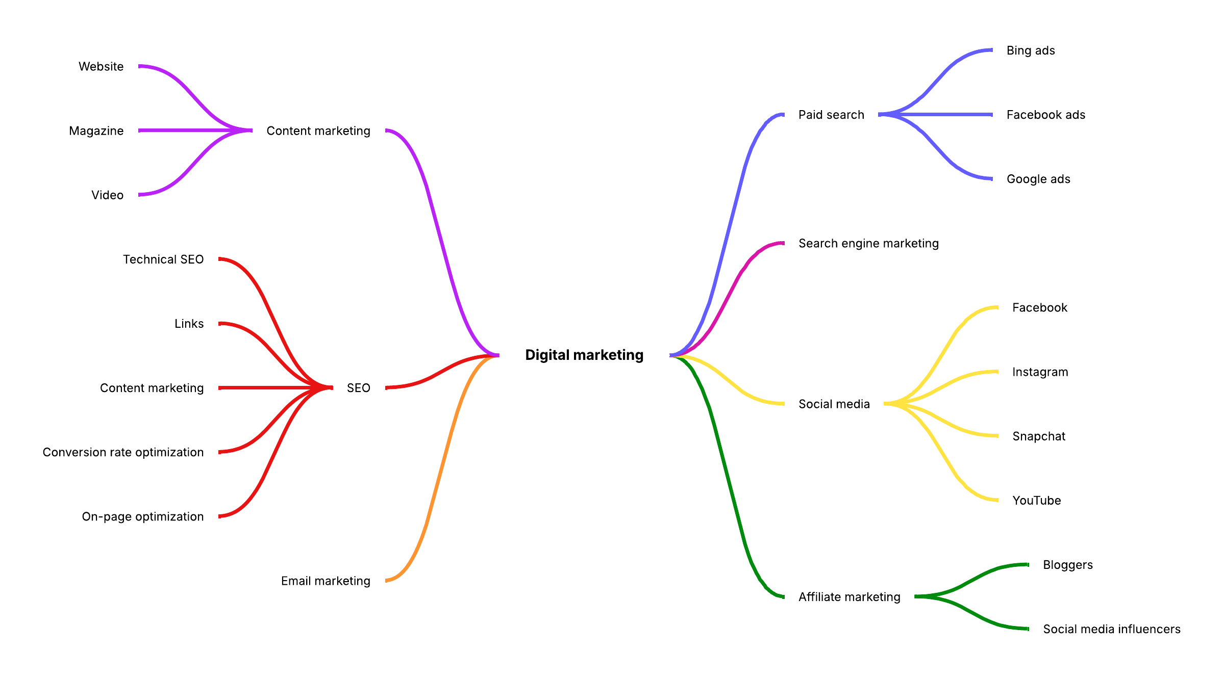 Open this template to view a detailed example of a digital marketing mind map that you can customize to your use case.