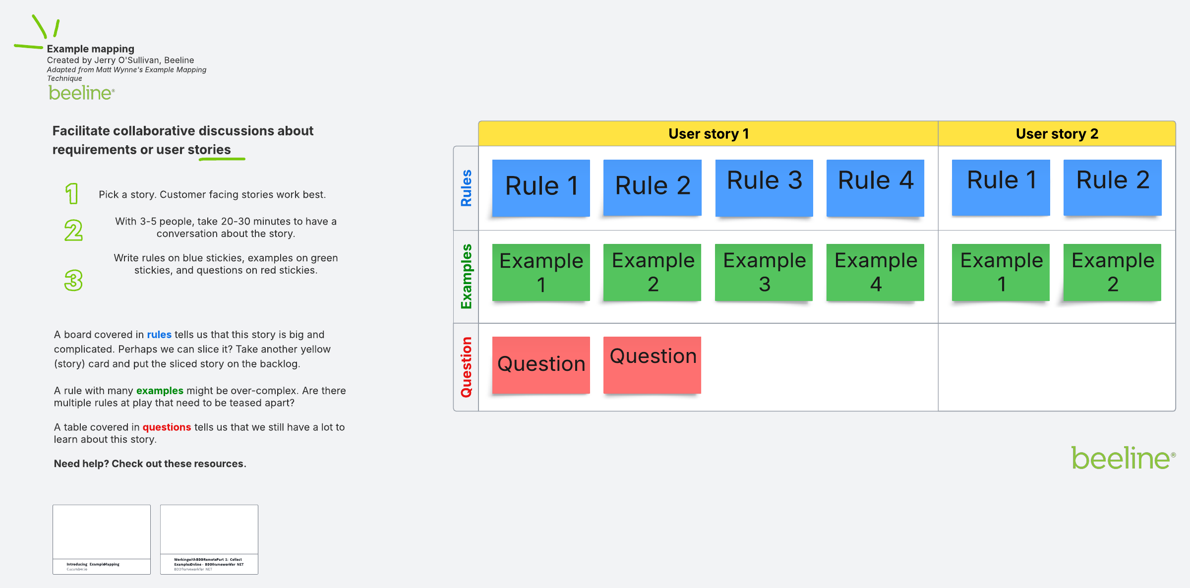 This is where Lucidspark’s example mapping template comes in. Created in collaboration with Jerry O’Sullivan, Head of Delivery at Beeline, this template is an adaptation of Matt Wynne’s Example Mapping technique.