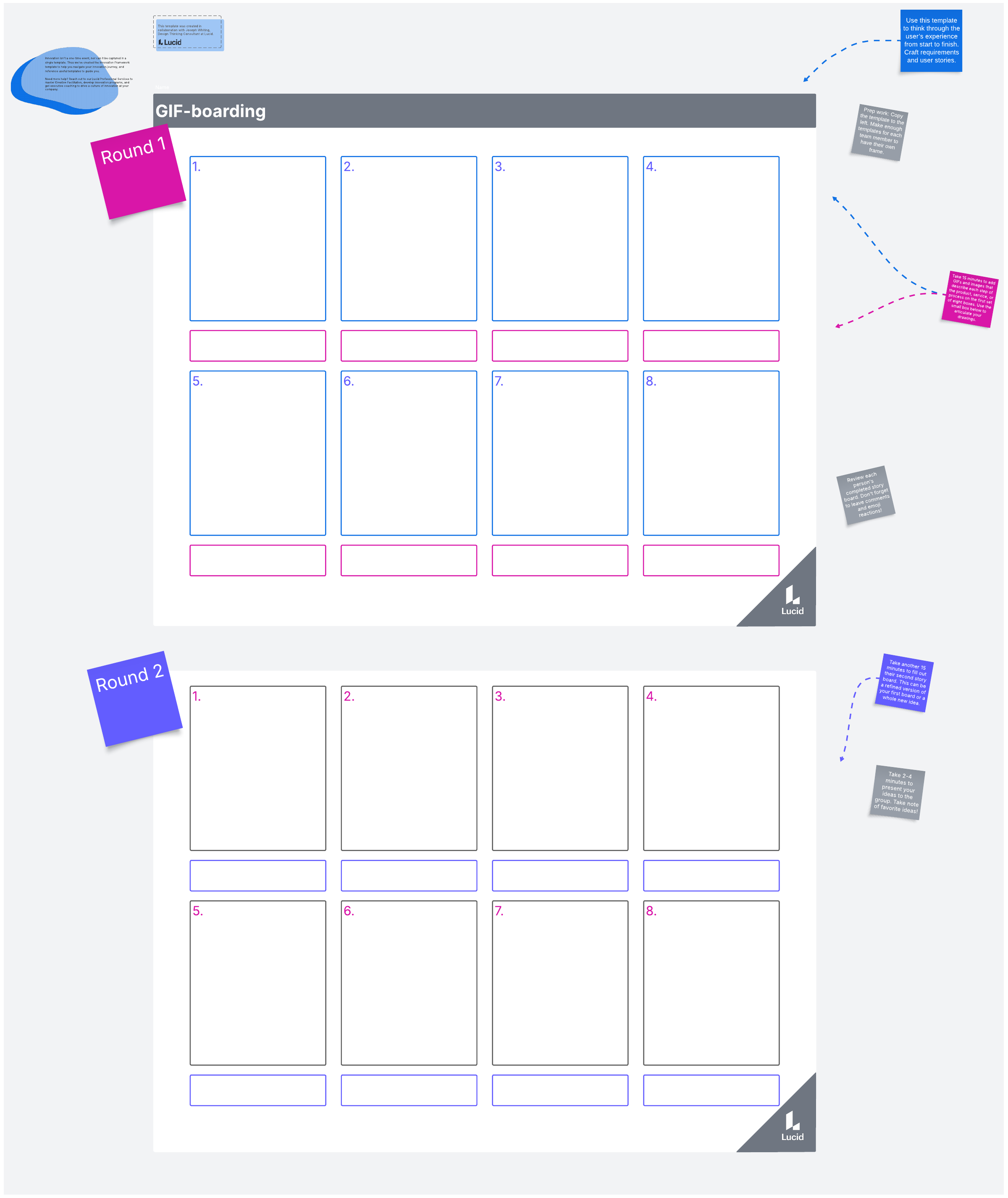 1. Set a timer for 15 minutes. Have each team member add GIFs and images that describe the problem that you’re trying to solve for your users to the first box on their own template. They may also add text to the sticky notes to label the images and better articulate their context.