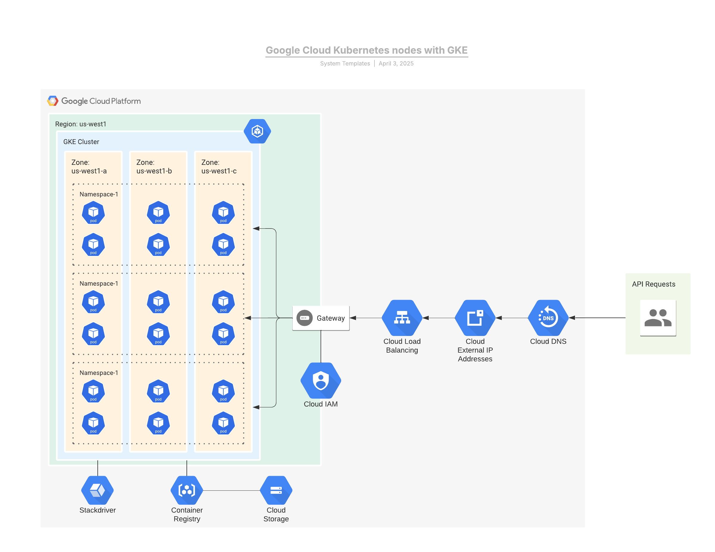 Open this template to view a Google Cloud Kubernetes nodes with GKE reference architecture that you can customize to your use case.
