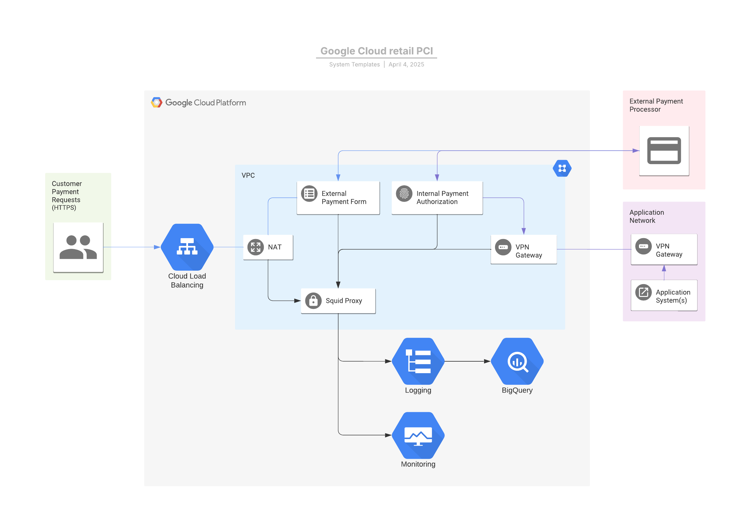 Open this template to view a Google Cloud retail PCI reference architecture that you can customize to your use case.
