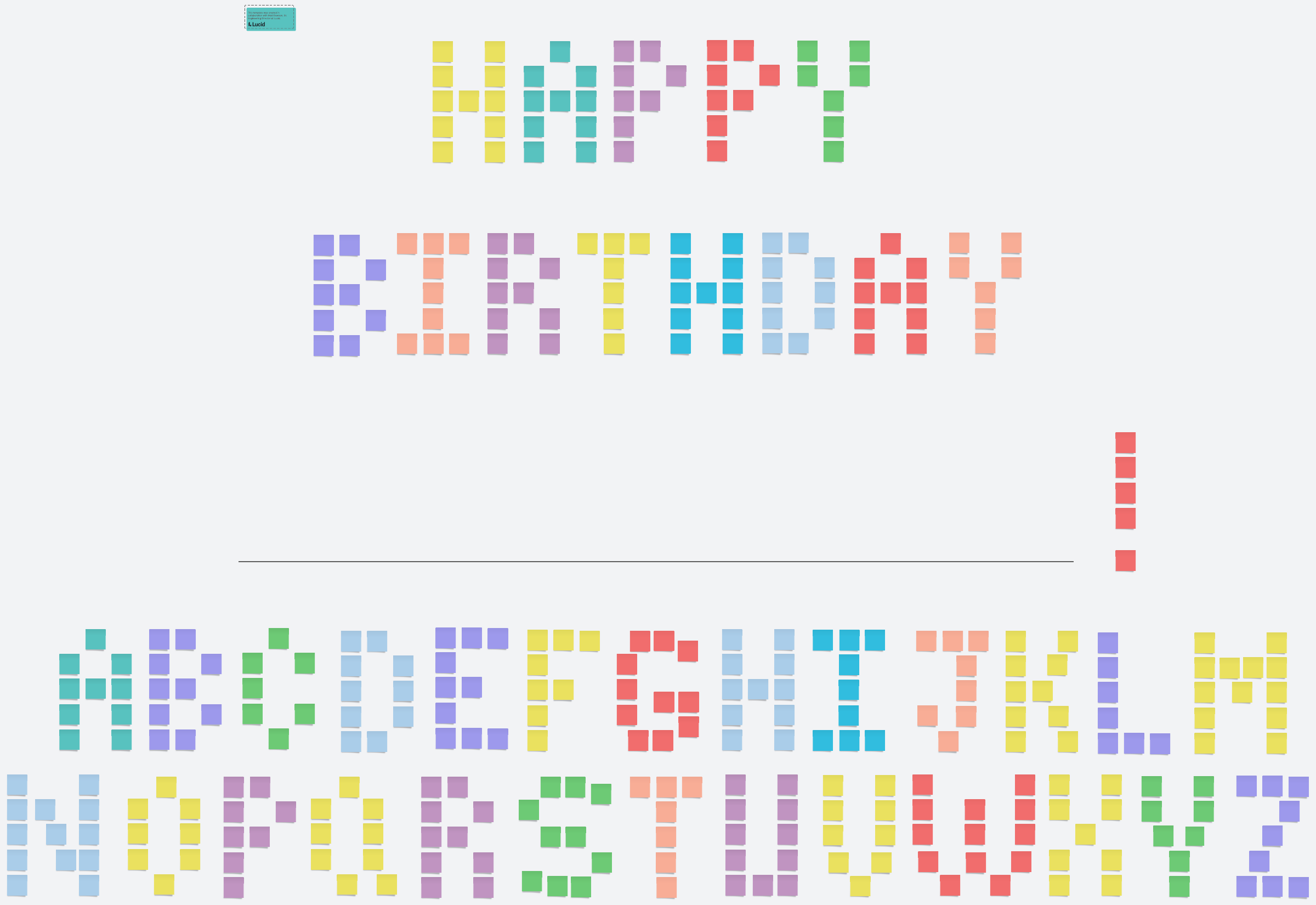 Lucidspark’s happy birthday card template can be a thoughtful and convenient way for everyone to help make someone’s birthday more special. The template uses virtual sticky notes to spell out “Happy Birthday,” with the entire alphabet also spelled out so you can quickly copy and paste your coworker’s name into the space provided.