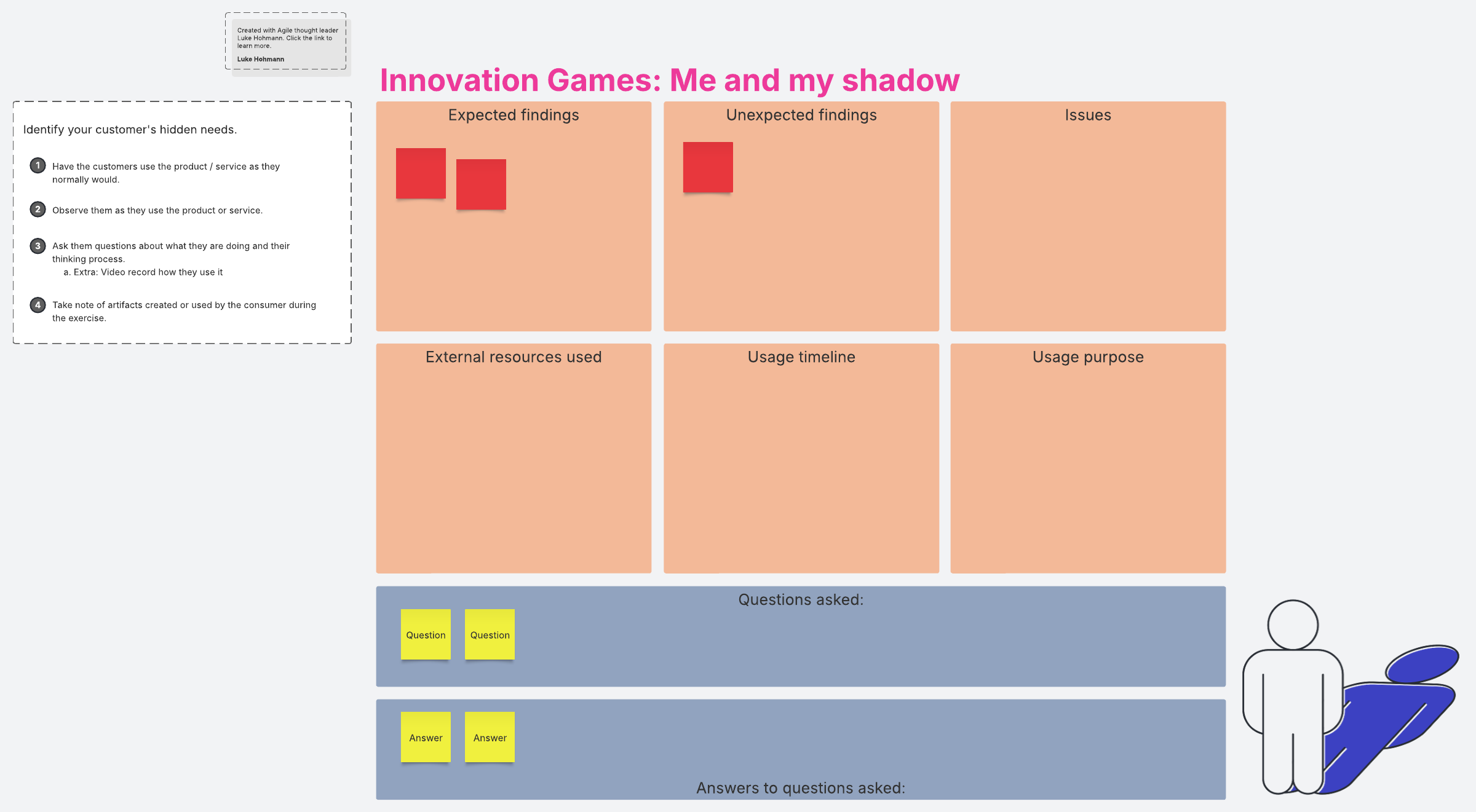 Use this template to take a game-based approach at Identifying the hidden needs of customers by shadowing their use of your product.