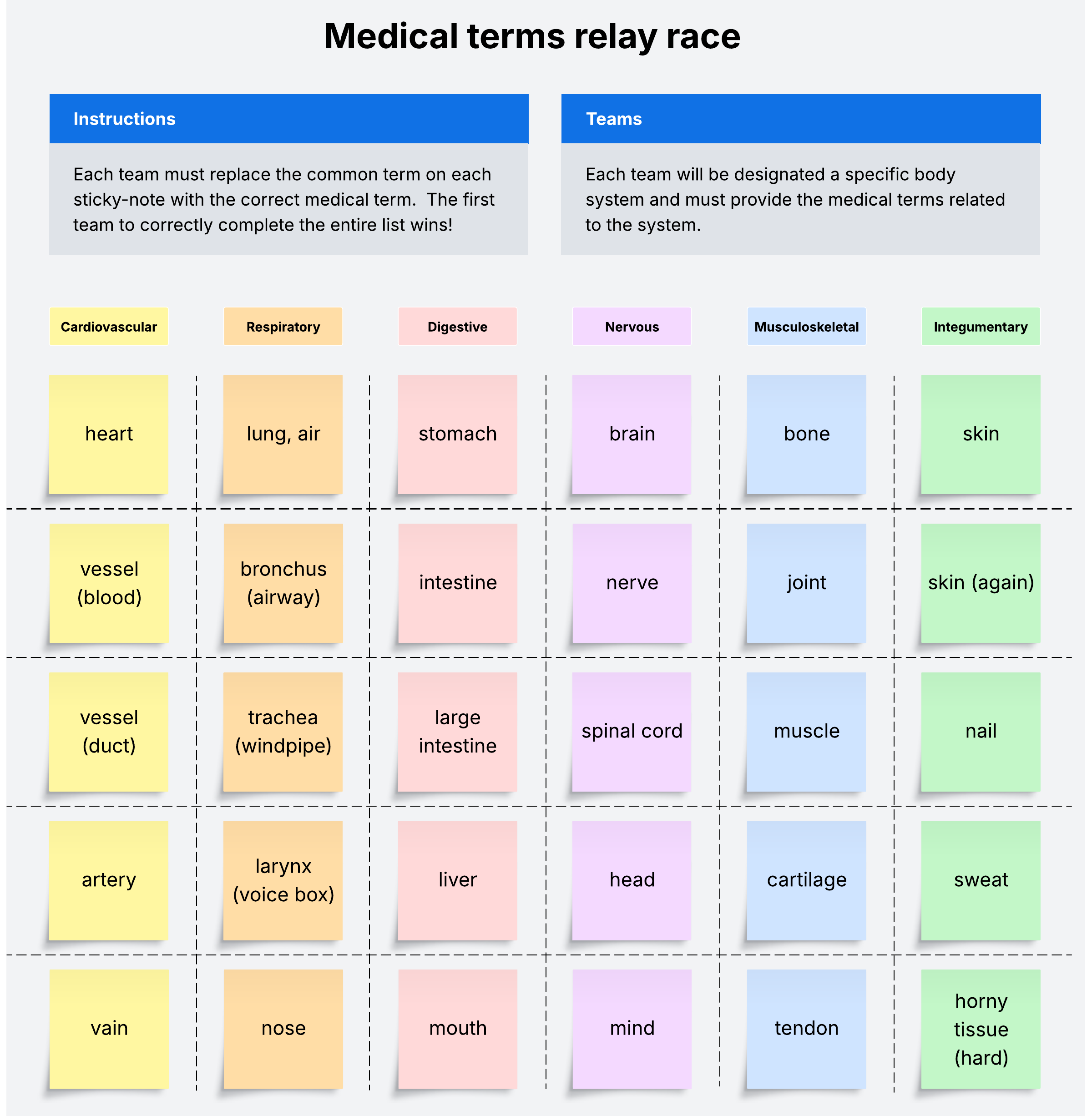 This Medical Terminology Relay Race template can help you: