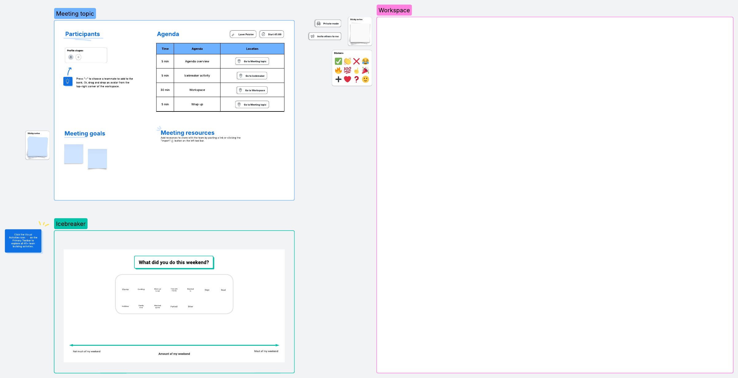 - Use the workspace provided to achieve your goals during the meeting, whether you need to brainstorm, plan, or make decisions. To further facilitate meeting activities, you can insert any other relevant Lucidspark templates into this space.