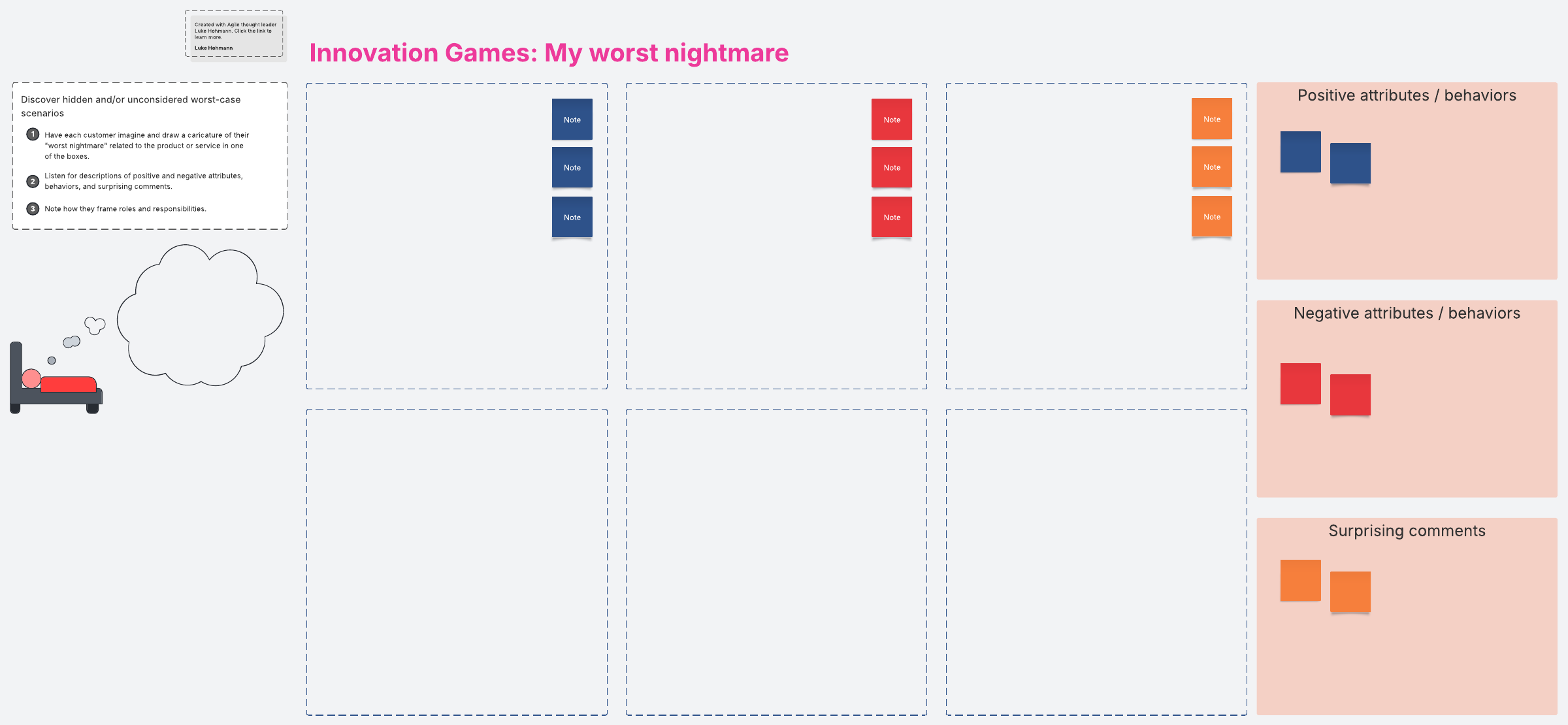 The My Worst Nightmare Innovation Game gets to the heart of what your clients are afraid of. The players brainstorm the worst-case scenarios for your customers when they use your product or service.