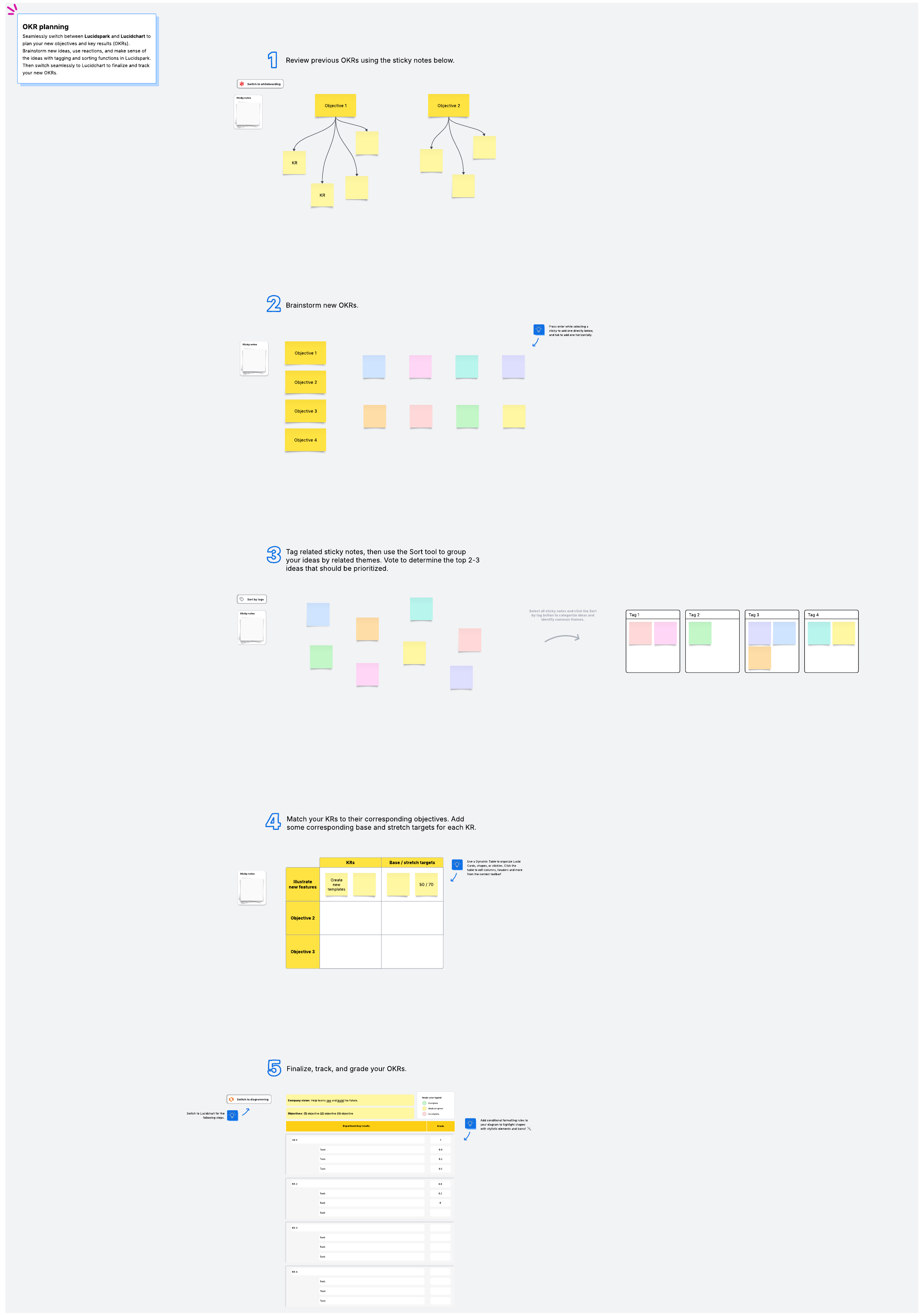 Use the Lucid Suite to effectively plan your team OKRs. Review previous OKRs, brainstorm and align around new ideas for the quarter, and switch seamlessly to Lucidchart to finalize and track your new OKRs.