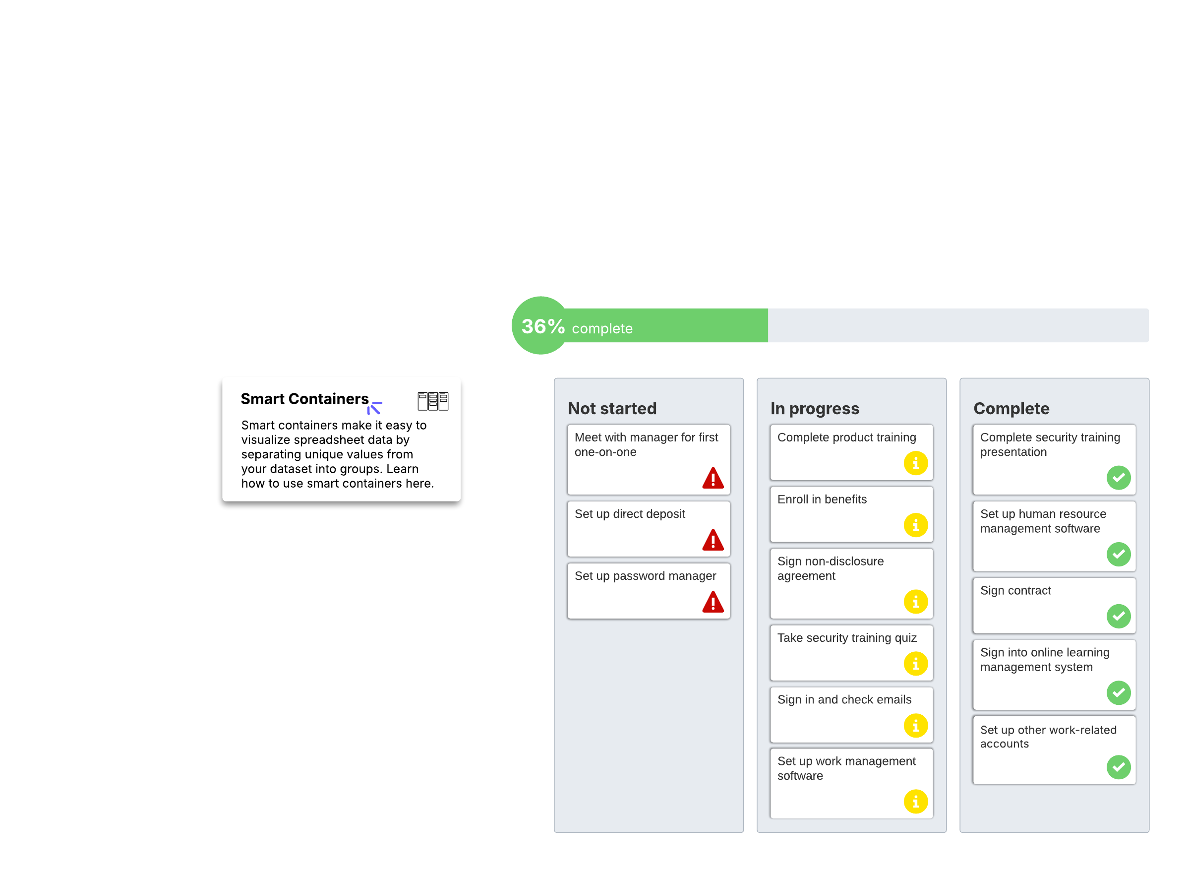 Open this template to view a detailed example of an onboarding taskboard that you can customize to your use case.