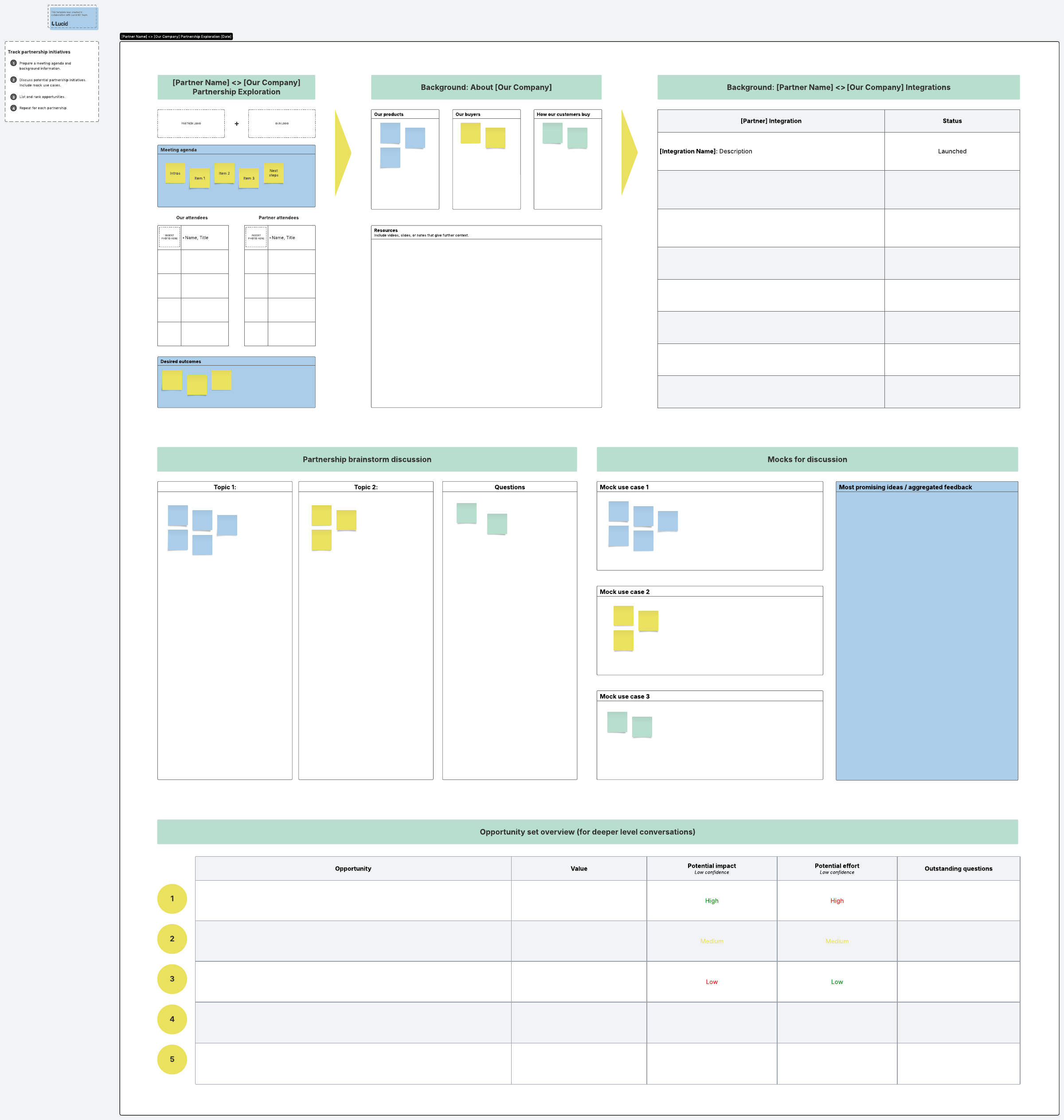 Fortunately, Lucidspark offers a partnership exploration template to help you track the past, present, and potential outcomes of any partnership. Our template can help you plan meetings, outline talks, propose new integrations, list opportunities you may be missing, and determine use cases for new aspects of your partnership.