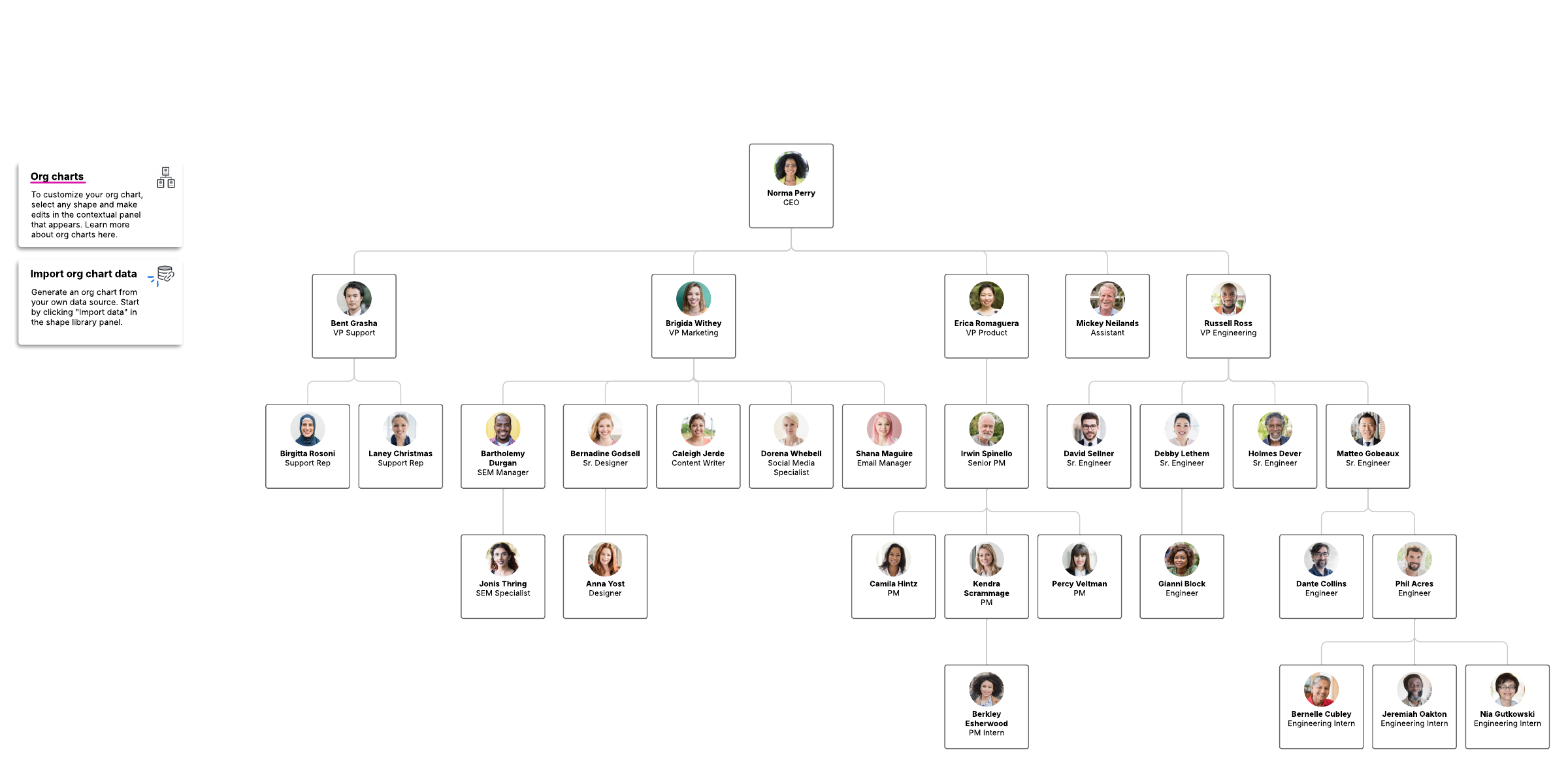 Open this template to view a detailed example of a pay equity org chart that you can customize to your use case.