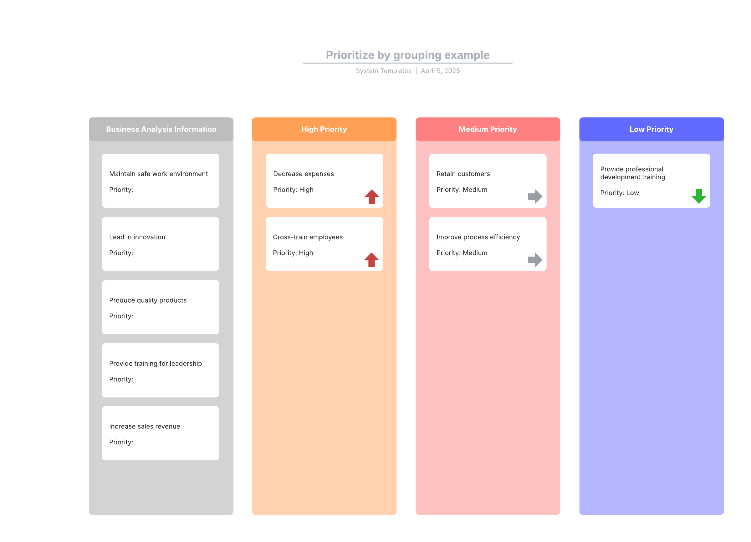 Open this template to view a detailed example of a prioritize by grouping diagram that you can customize to your use case.