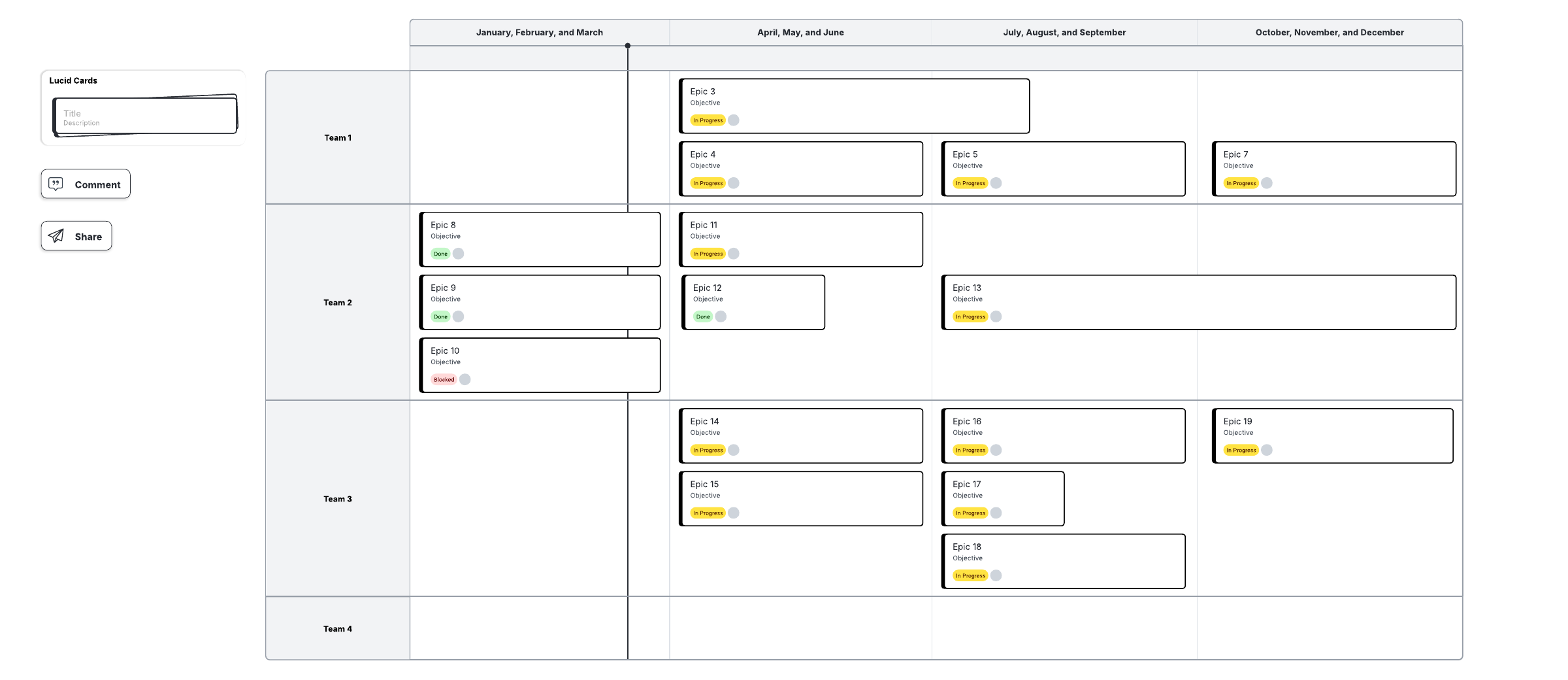 Lucid’s product roadmap template is designed to help you visualize and organize your company’s strategy around your product throughout each stage of its lifecycle. Show the status of epics and their assigned team and plan each quarter according to your team’s capacity using customizable visuals that you can update quickly and easily. Invite stakeholders to collaborate on your product roadmap to promote alignment, get feedback, and assign important action items.