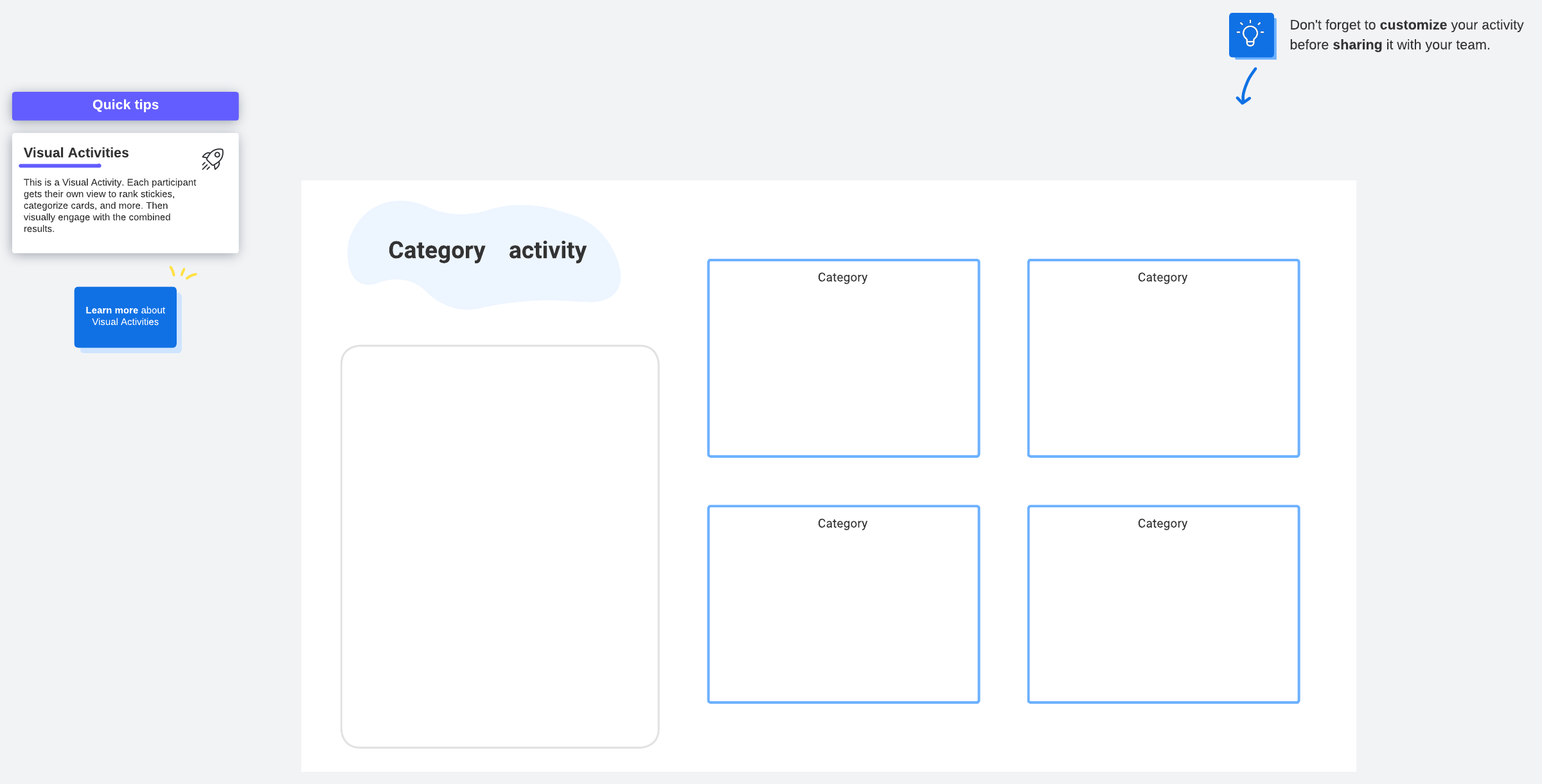 "This activity has four blank categories that participants can organize ideas into. Category activities are used to understand agreement about how items should be grouped together. For example: