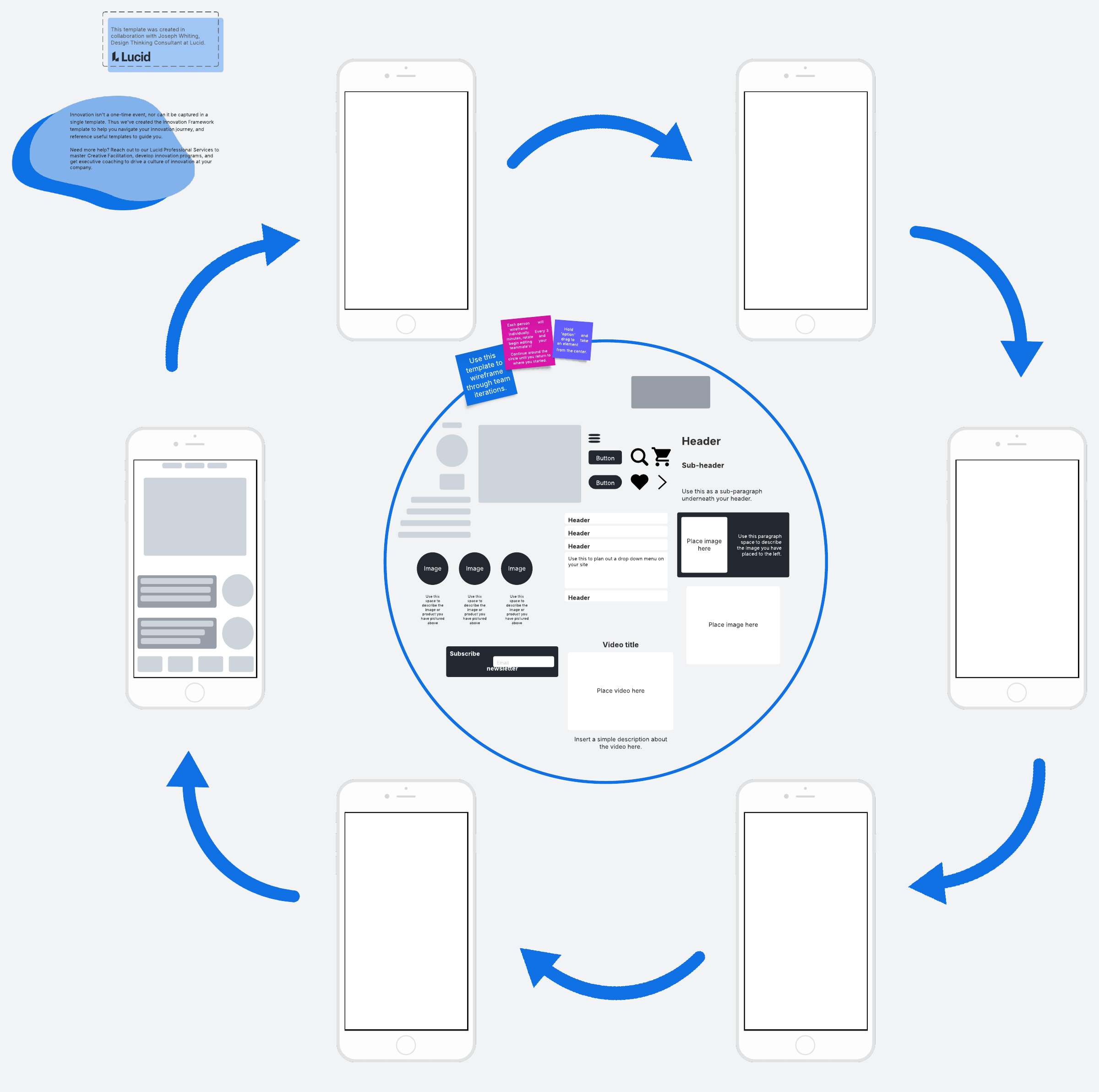 - Use this template to wireframe through team iterations. Begin by setting a timer for three minutes. Then, instruct each person on your team to wireframe individually. When the timer runs out, rotate the template and begin editing your teammate's wireframe. Continue around the circle until you return to where you started.