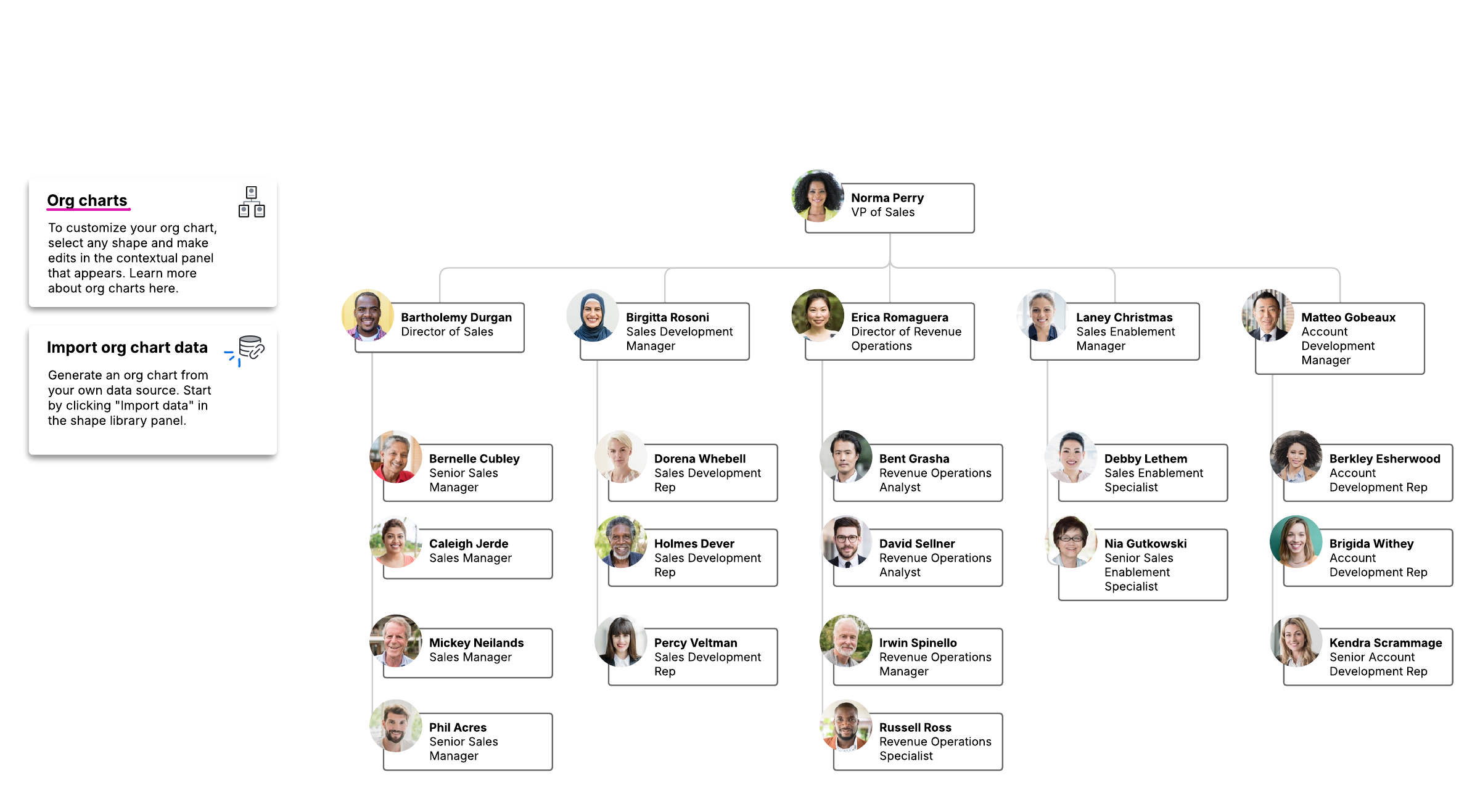 Open this template to view a detailed example of a sales org chart that you can customize to your use case.