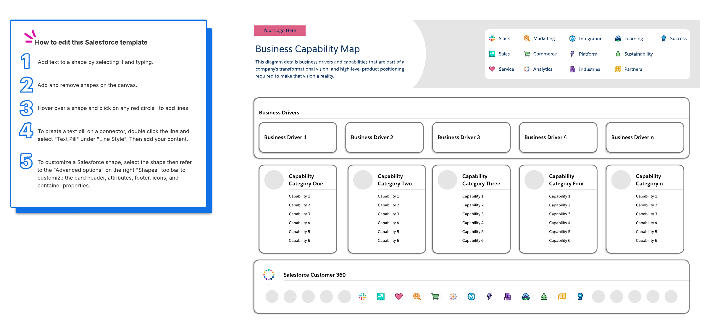Open this template and add content to customize this Salesforce business capability map to your use case.