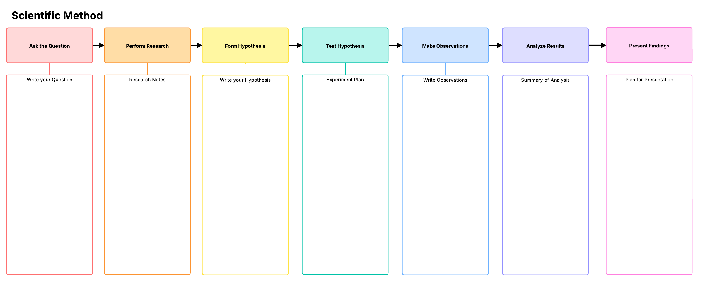 This template guides students through each step of the scientific method: Questioning, Research, Hypothesis, Testing Hypothesis with Experimentation, Observing, and Results Analysis