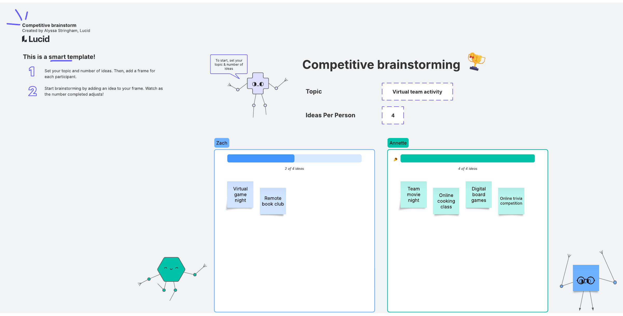 This is a smart template! How quickly can you and your teammates brainstorm? Set a goal and watch as the progress bar automatically updates as you add ideas to your board.