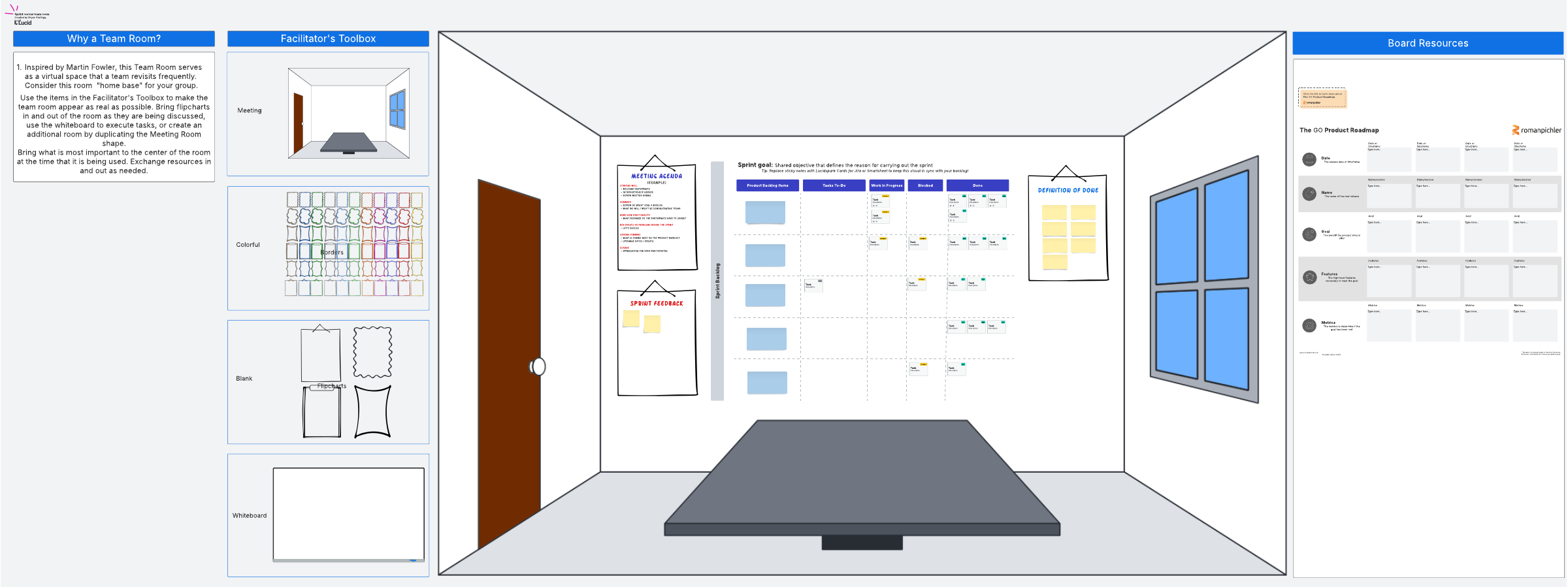 - Bring the most important items to the center of the room at the time that it’s being used. The room contains templates in one place for easy reference, including a meeting agenda, sprint feedback section, sprint backlog items, a definition of done section, and the GO product roadmap, so lean on them throughout your sprint review.