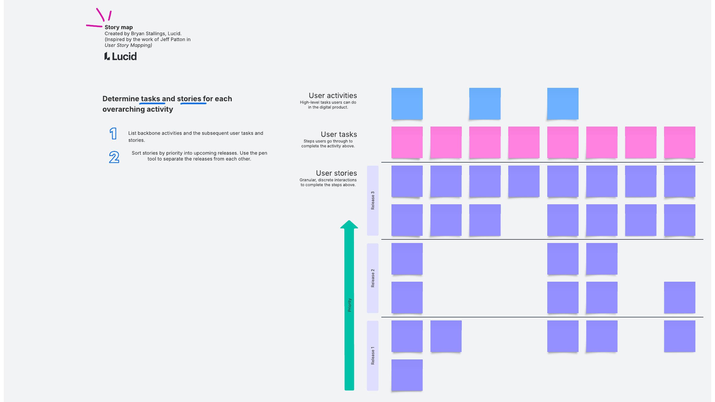 The story map template helps keep your users’ needs front and center. With a story map template, you can visualize activities (high-level tasks users can do in the digital product) and subsequent tasks (steps users go through to complete the activity) and stories (granular, discrete interactions) in terms of users so that you’re sure to be focusing on features that deliver real value.