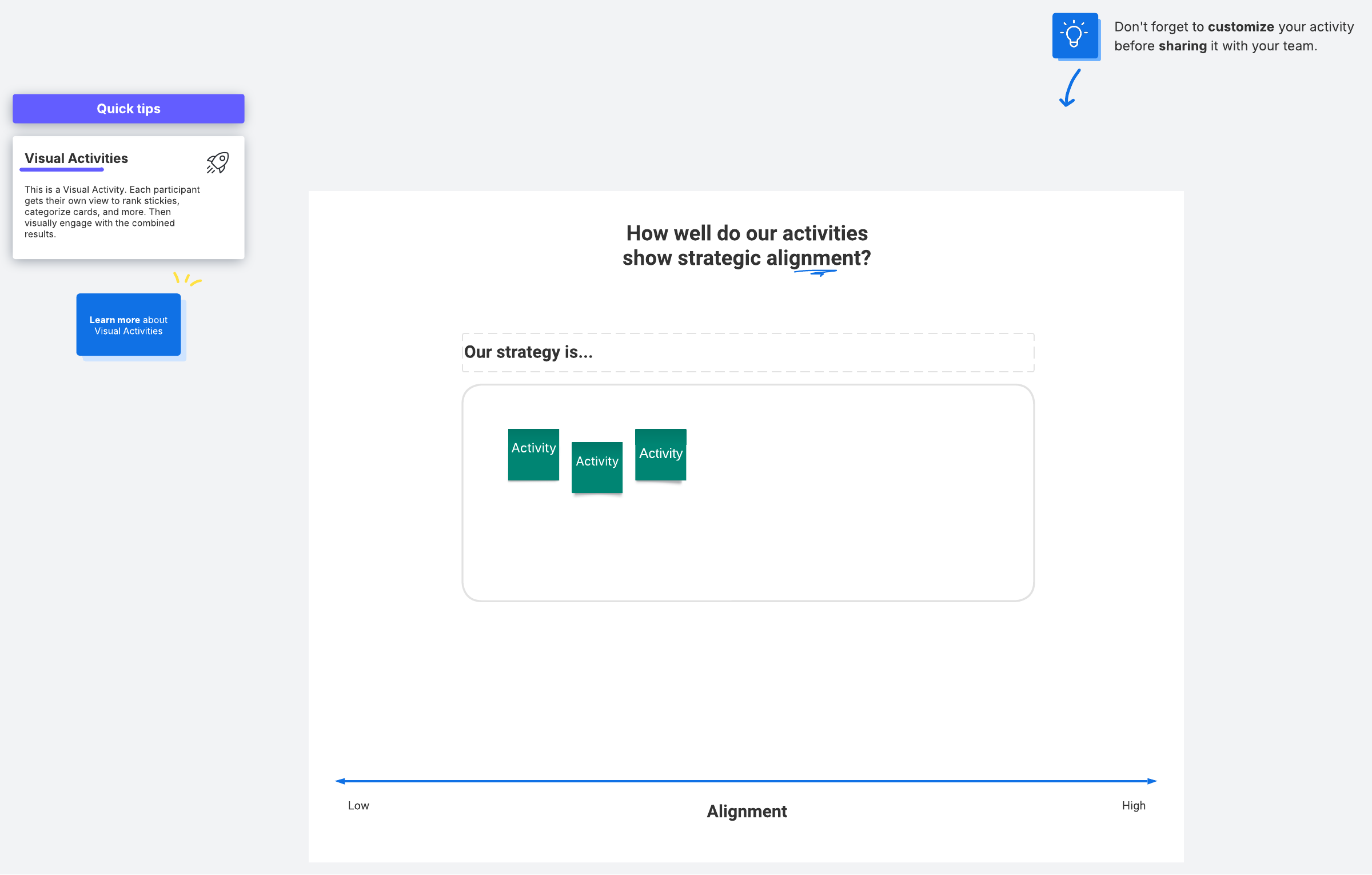 Decide how well your planned activities line up with your strategy or goals. See areas where your team is aligned and misaligned so you know where to focus future planning and discussion.