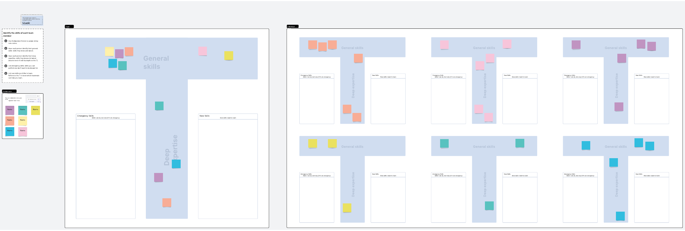 1. Have each team member pick a smaller T on the right of the template. Each T has a different color of sticky notes assigned to it, which you can set for each individual with Collaborator Colors.