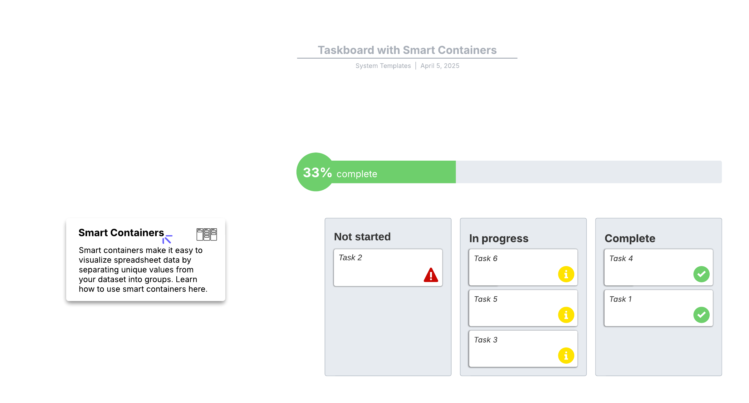 Open this template and add content to customize this basic taskboard with smart containers diagram to your use case.
