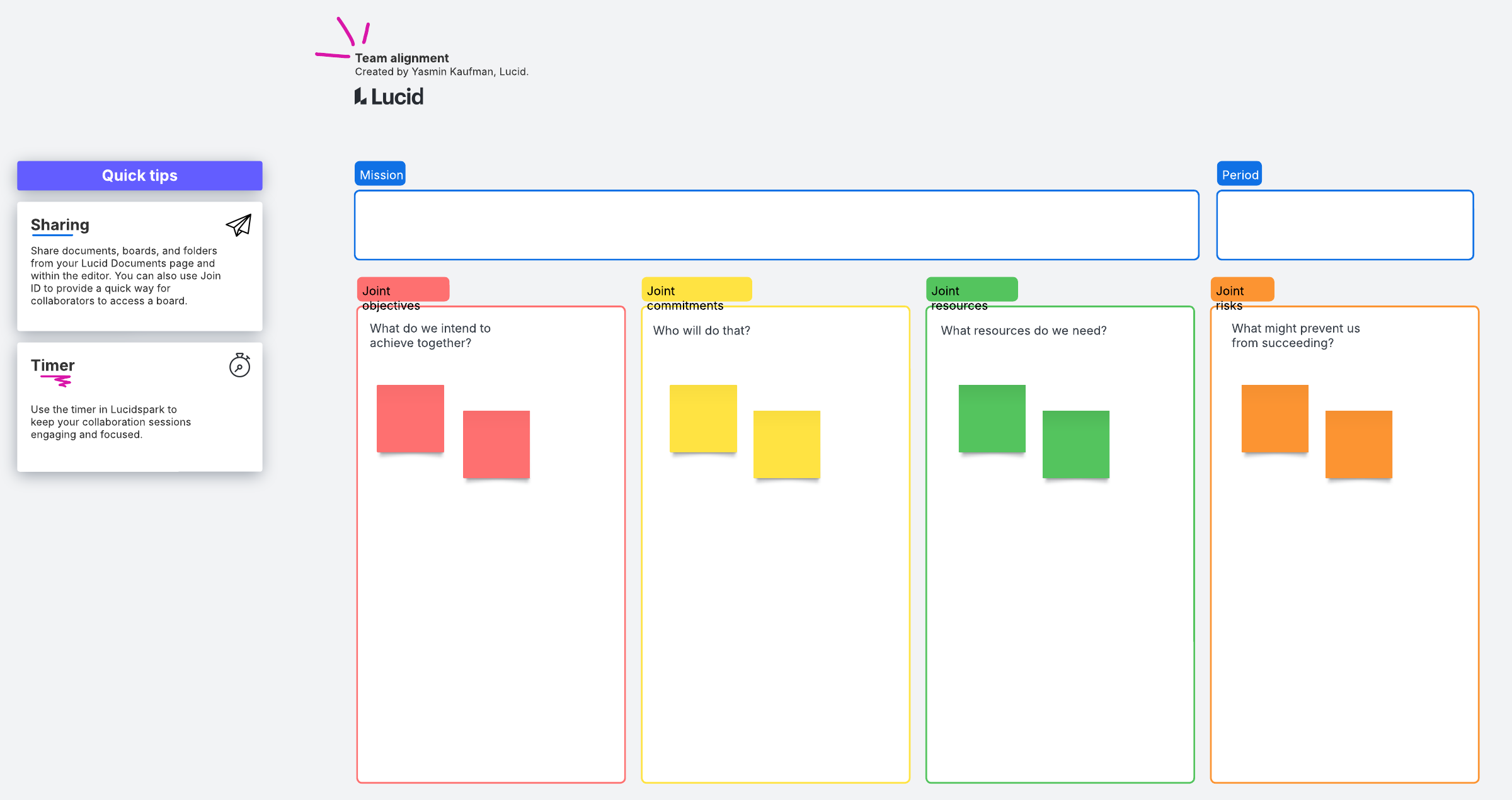 A Team Alignment Map is an Agile tool designed to align collaborators on project initiatives, clarify goals and resources, and reduce risks before starting a project. Created in collaboration with Lucid’s Senior Solutions Engineer and Lucid Suite technical expert Yasmin Kaufmann, our team alignment template is ideal for visualizing tasks and maximizing efficiency as you begin your project.