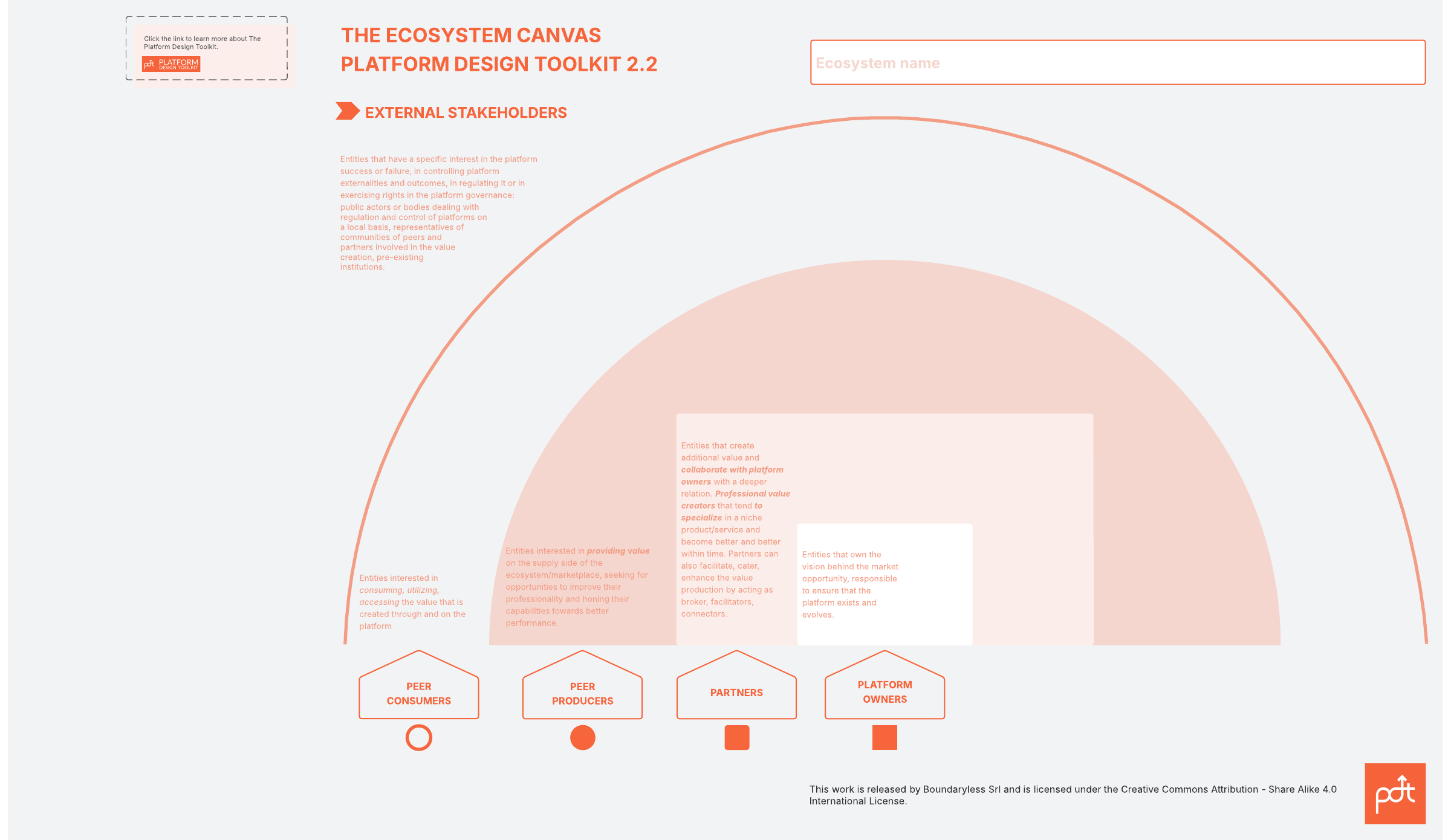 Use this ecosystem canvas from Platform Design Toolkit to reflect on the ecosystem you’re looking to shape and to organize your platform strategy.