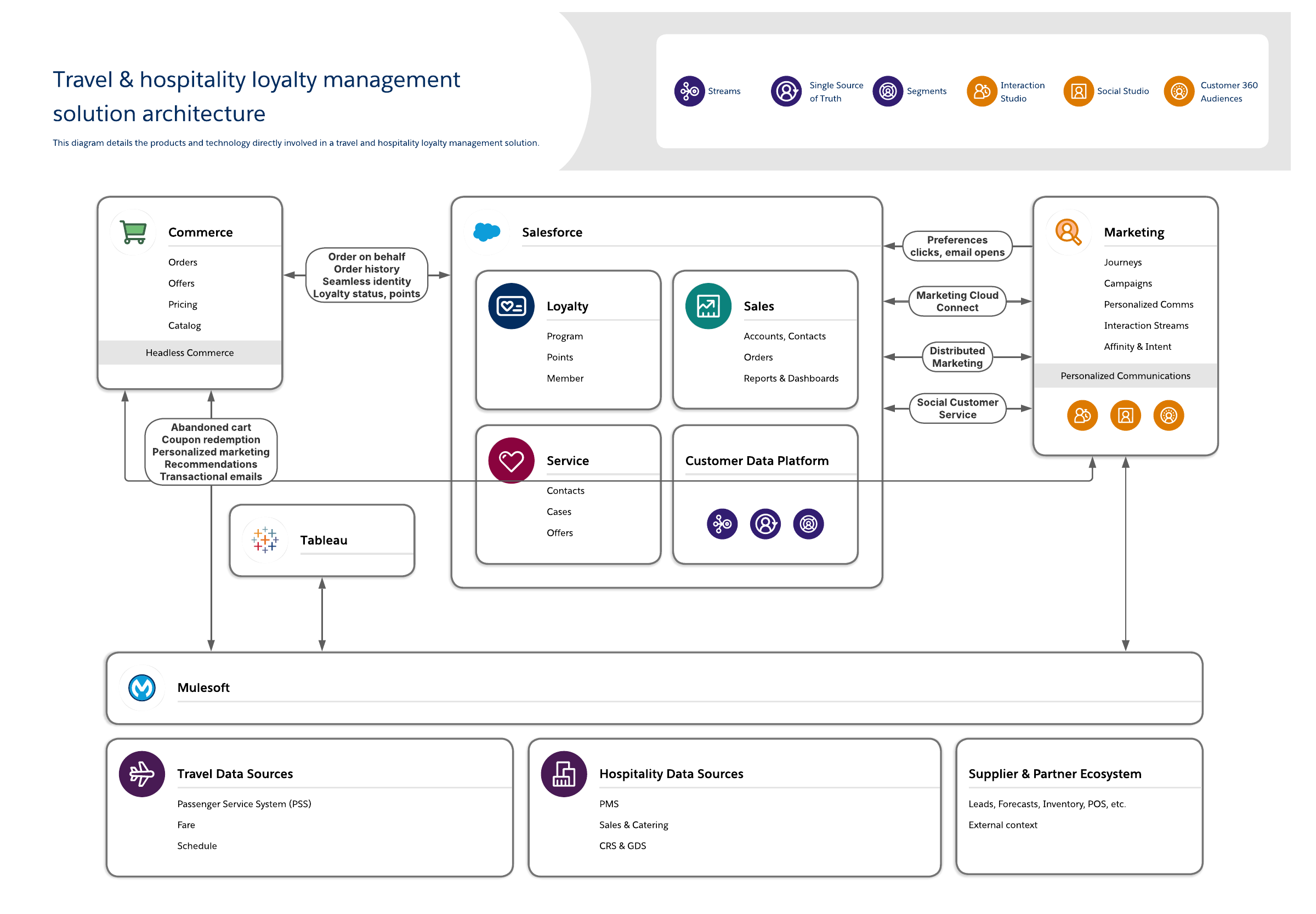 - Show the products and technologies involved in a travel and hospitality loyalty management solution.