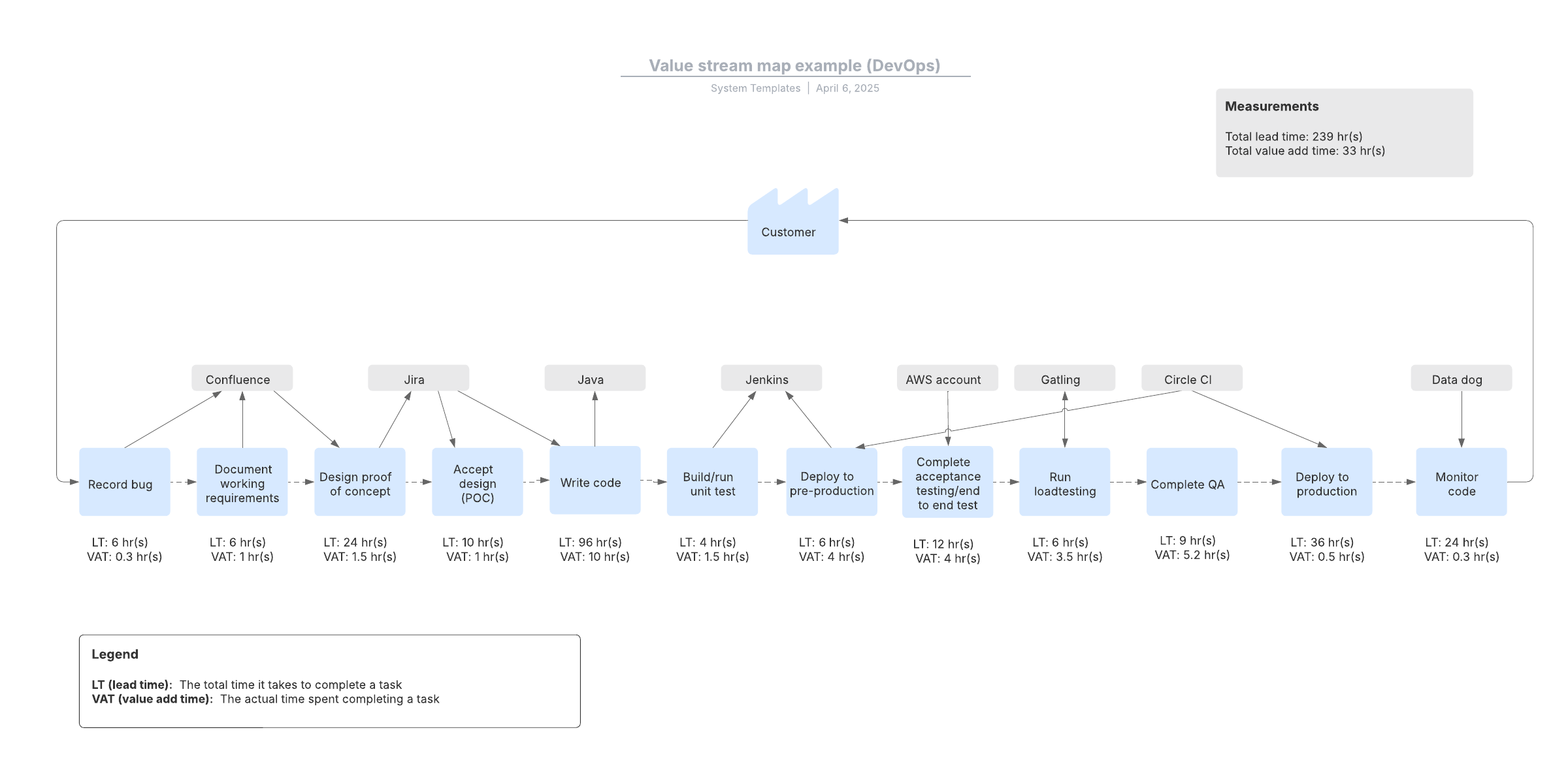 Open this template to view a detailed example of a value stream map (DevOps) that you can customize to your use case.