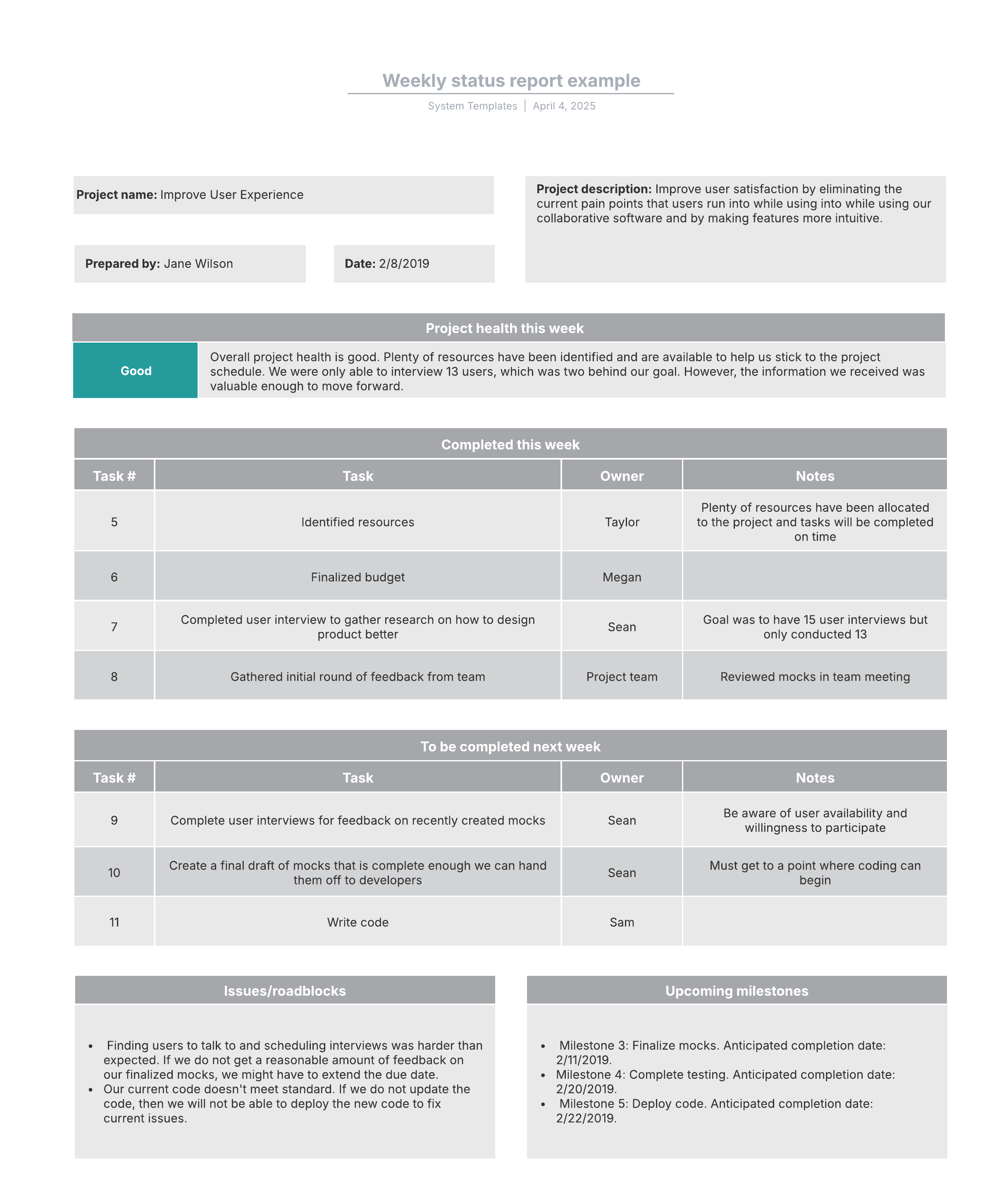 Open this template to view a detailed example of a project status report that you can customize to your use case.